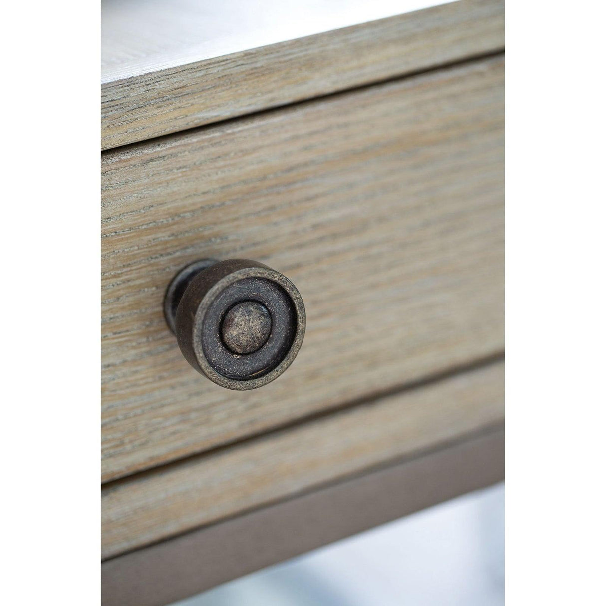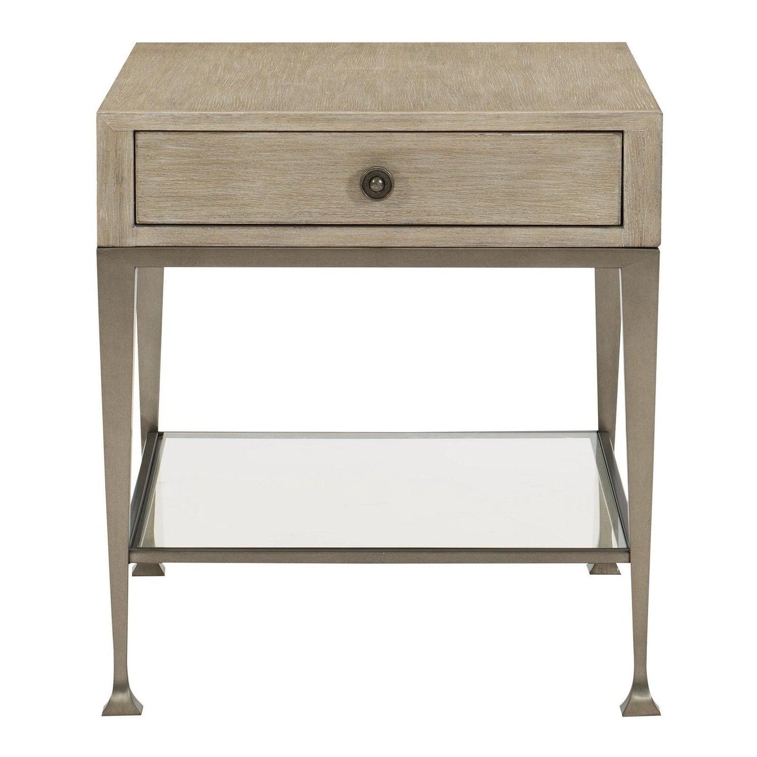 - Stainless Steel base in Vintage Nickel finish with one inset tempered glass shelf