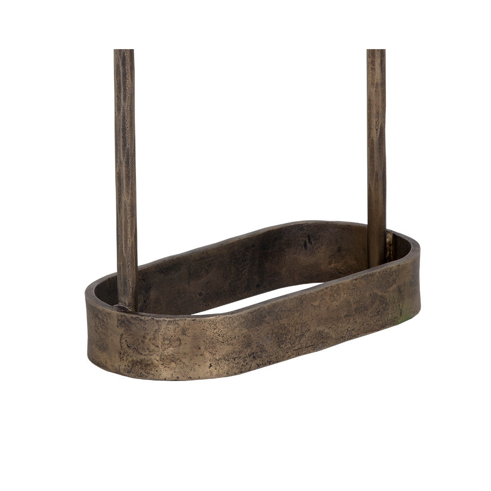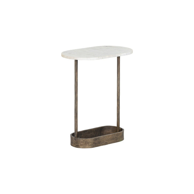A side table inspired by global travels with a minimalist silhouette. Features a white marble tabletop with a structured hammered iron base in an antique brass finish. Made in India: With refined craftsmanship, this design was brought to life by skilled local artisans. By nature, these materials develop unique imperfections such as fissures, markings and colour variations for a truly one-of-a-kind piece.