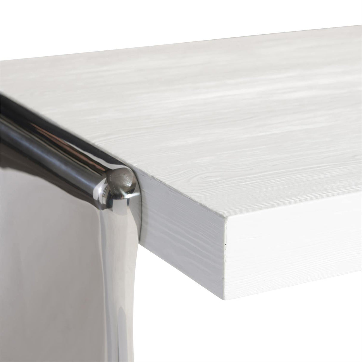 - Dimension and polish give the shapes the look of liquid metal as they brace the wood top and bottom shelves which are in Azucar finish.
