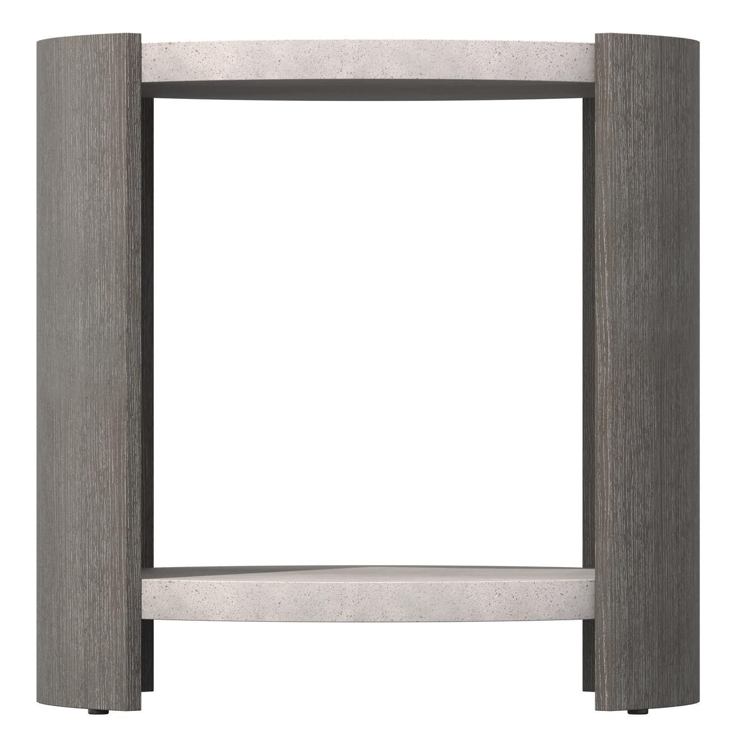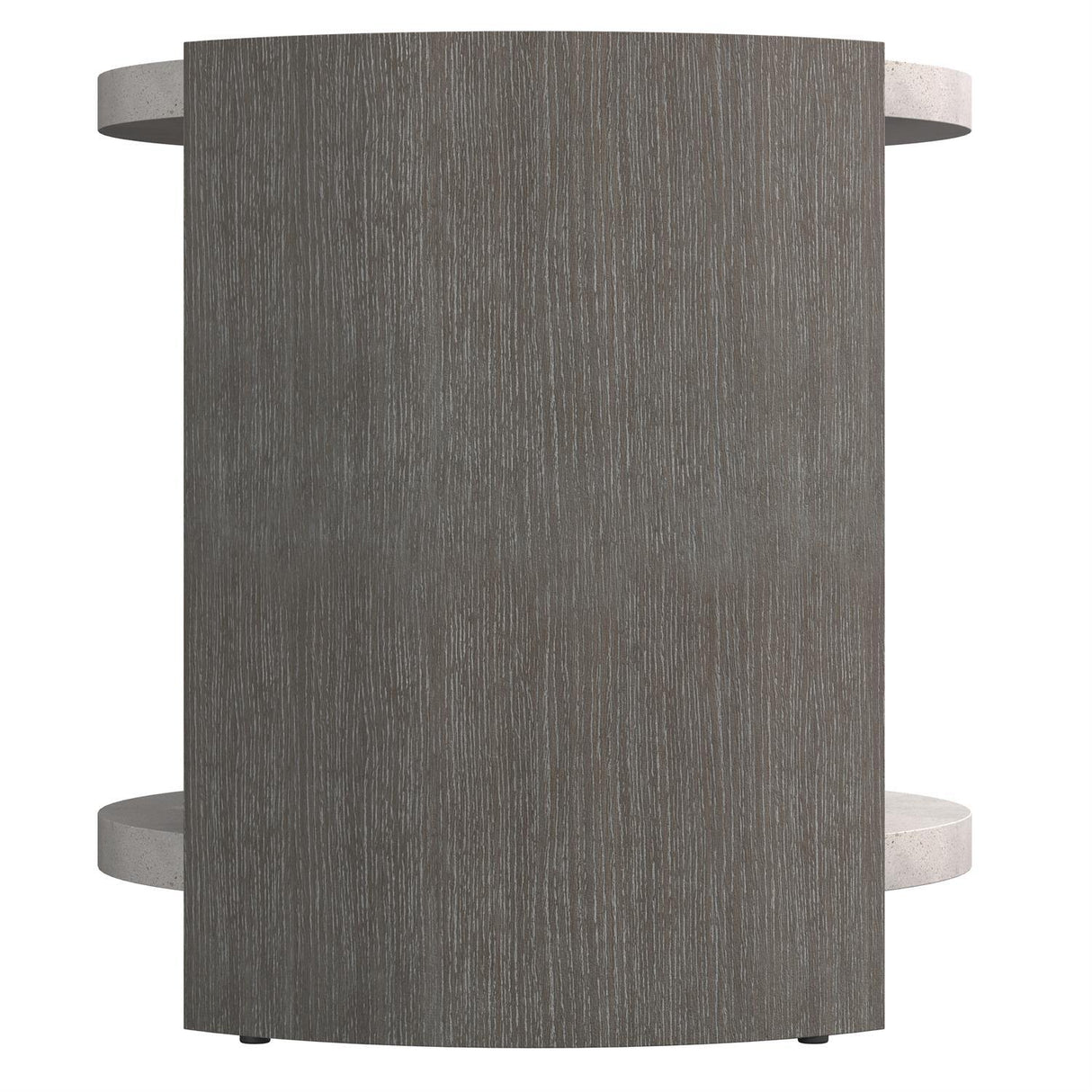 • Two curved wood panels in a Porcini finish surround and support a round cast glass-reinforced concrete top and lower shelf.