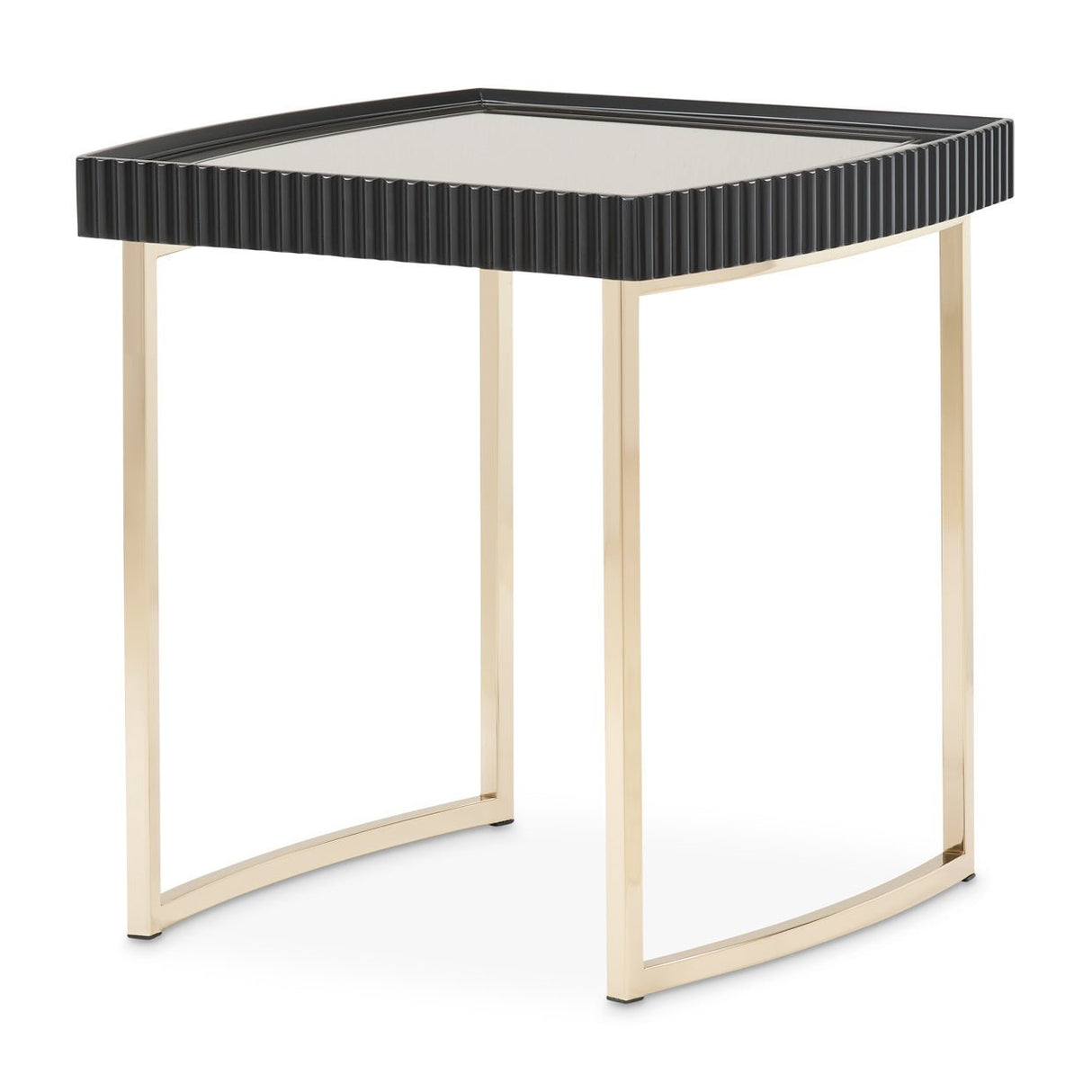 The Lisbon Side Table by Aico Furniture is an exquisite blend of modern artistry and quiet luxury. Available in Silken Matte Cream or Silken Matte Black, this sculptural accent table features a rhythmic reeded texture, curved silhouette, tinted mirrored glass top, and polished gold sled base—capturing timeless sophistication and luminous elegance for any modern interior.