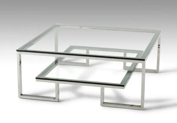 Two tiered geometric squares made of 12mm clear tempered glass are framed with stainless steel, creating two levels of storage space for displays. This clean and contemporary design will look amazing in any home. Display next to a sofa set that also has stainless steel accents to tie the look together.