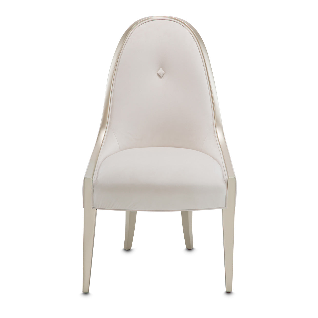 Perfect for homeowners seeking a bright, modern-glam dining room with platinum accents, flexible seating, and styling that harmonizes across multiple spaces.