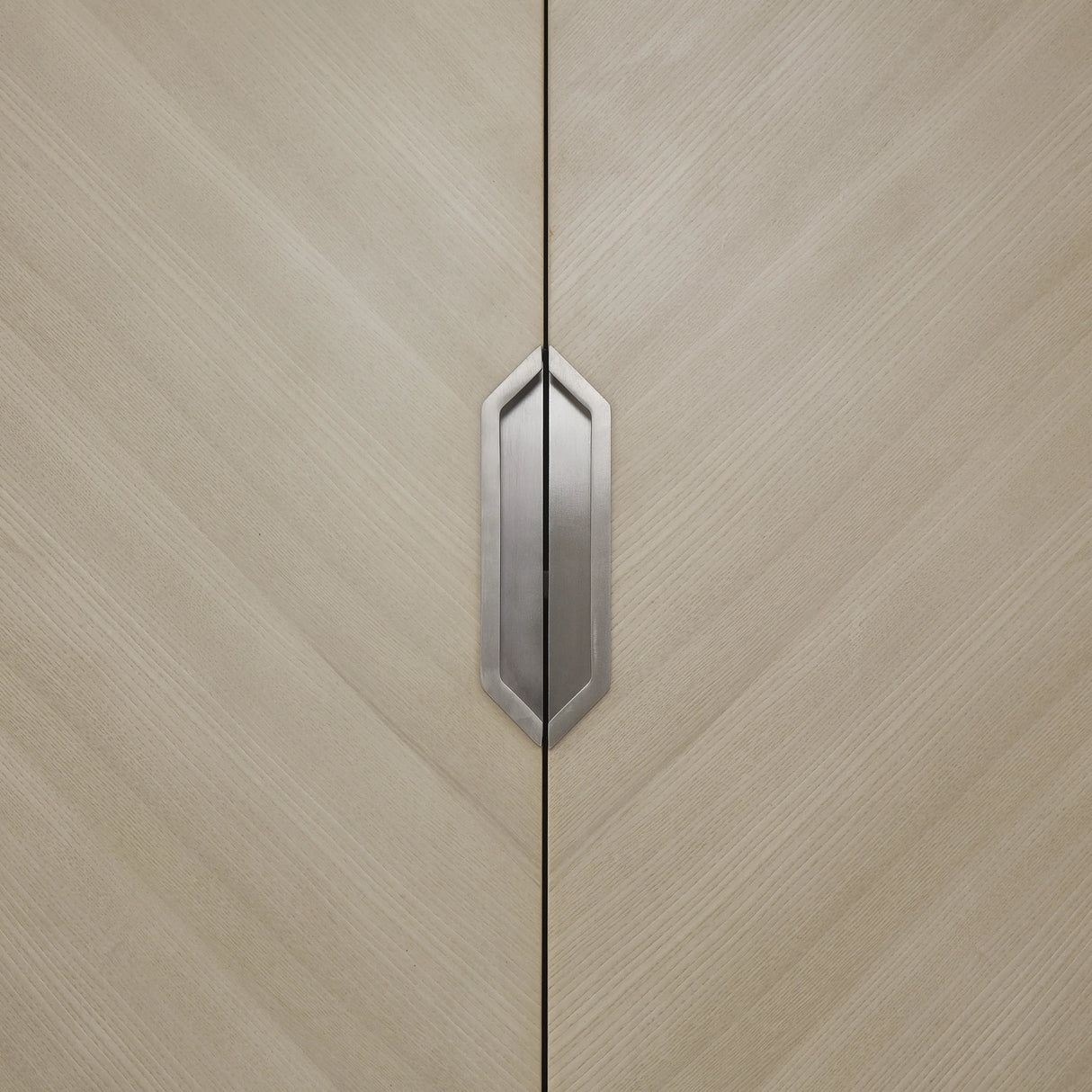 - Brushed stainless steel geometric cabinet pulls for modern flair