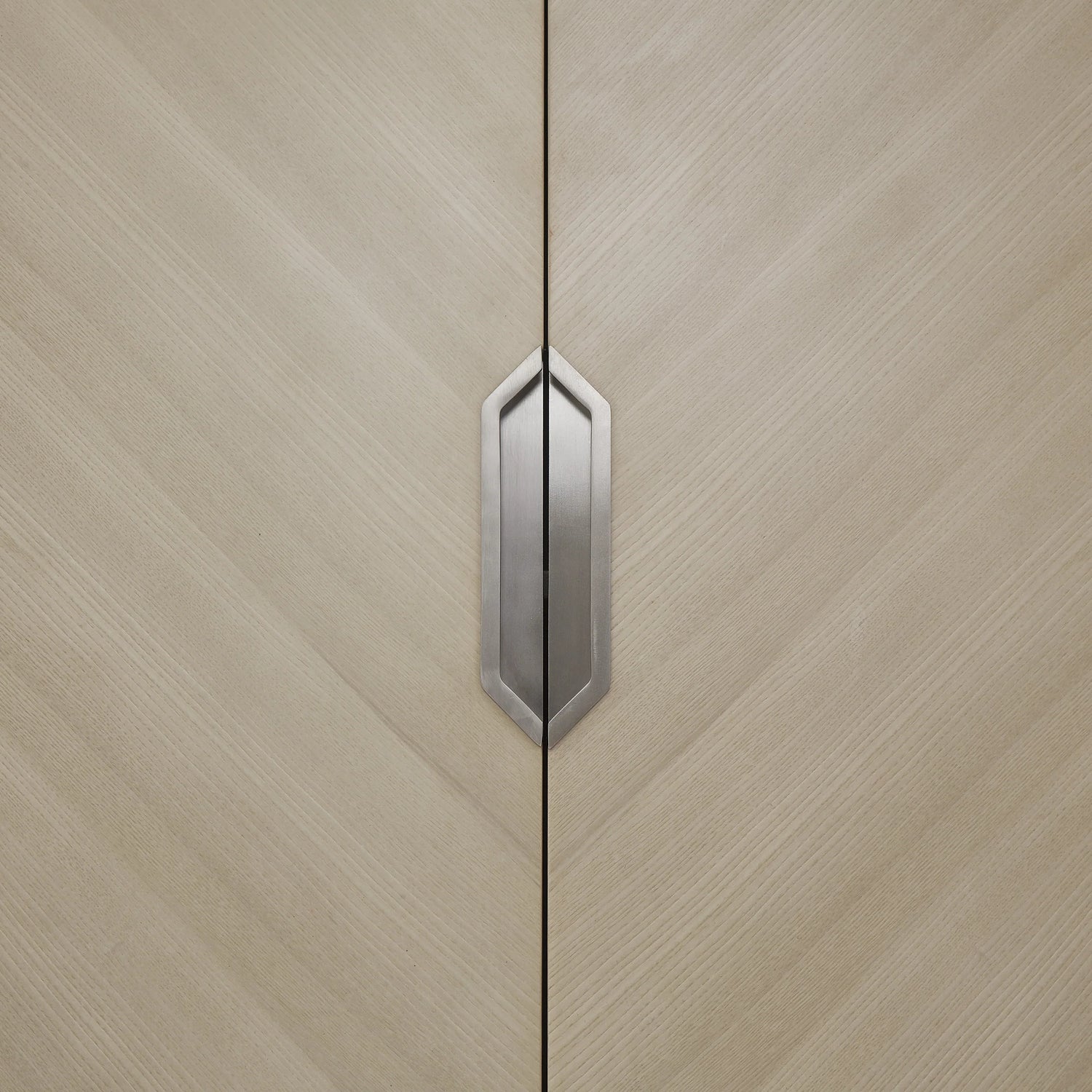 Crafted for contemporary elegance, the Penthouse Sideboard showcases a marble top, geometric hardware, and adjustable internal storage. The sleek Ash Gray finish and refined veneer pattern provide bold contrast suited for modern luxury interiors. Solid and engineered components offer durability and upscale style in one striking package.