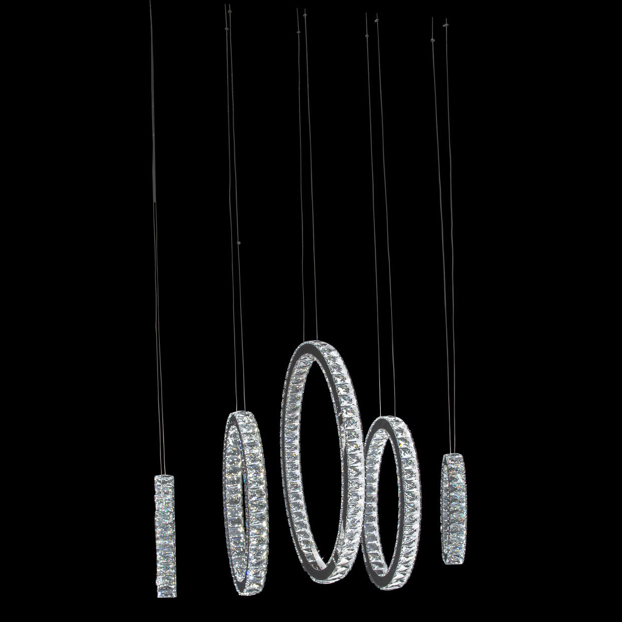 Make a contemporary statement with the Solar Hoops chandelier. 5 hoop rings of double walled cut glass hang vertically on adjustable lines, set with dimmable LED lights.