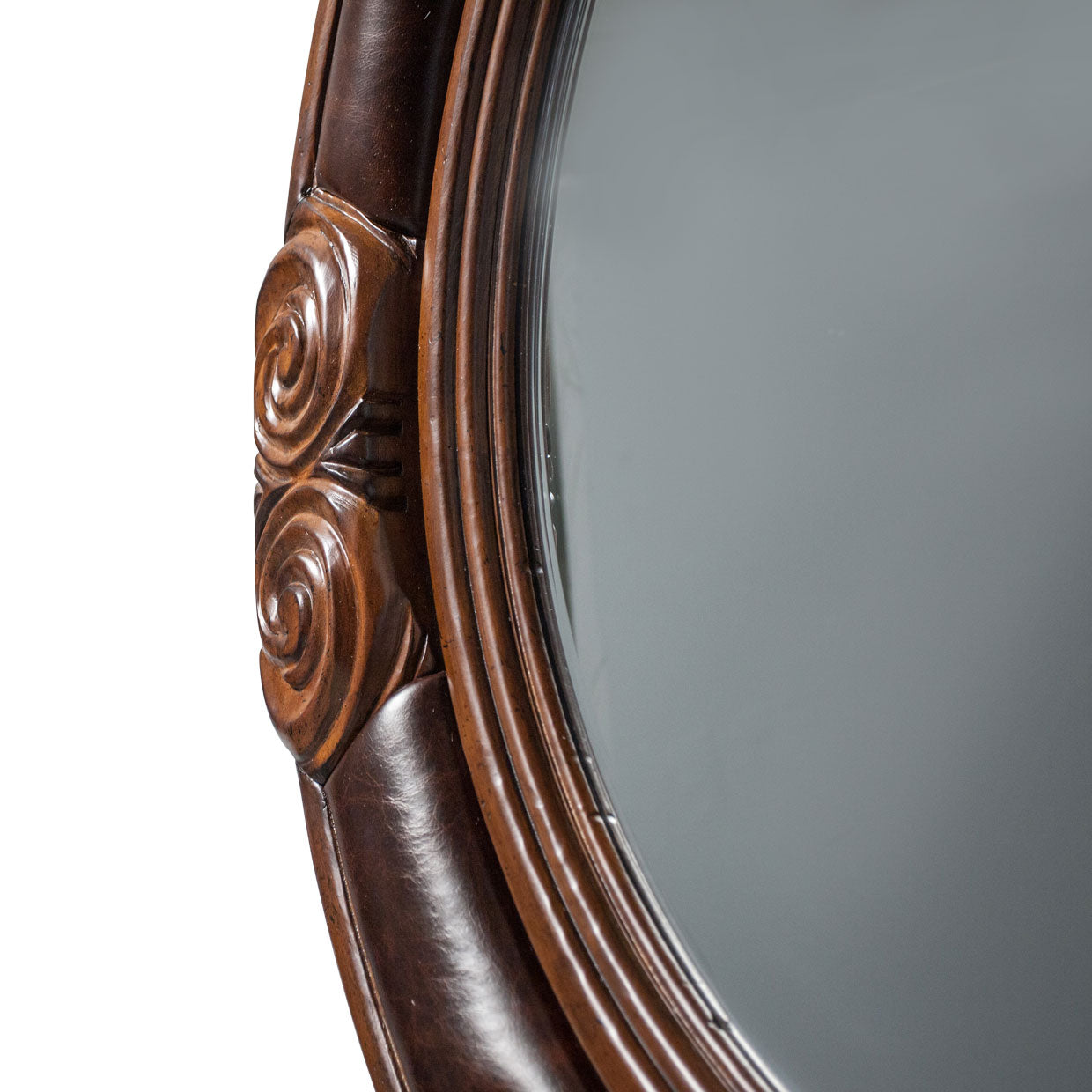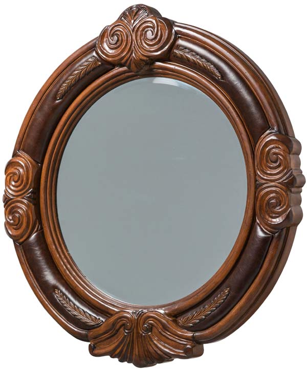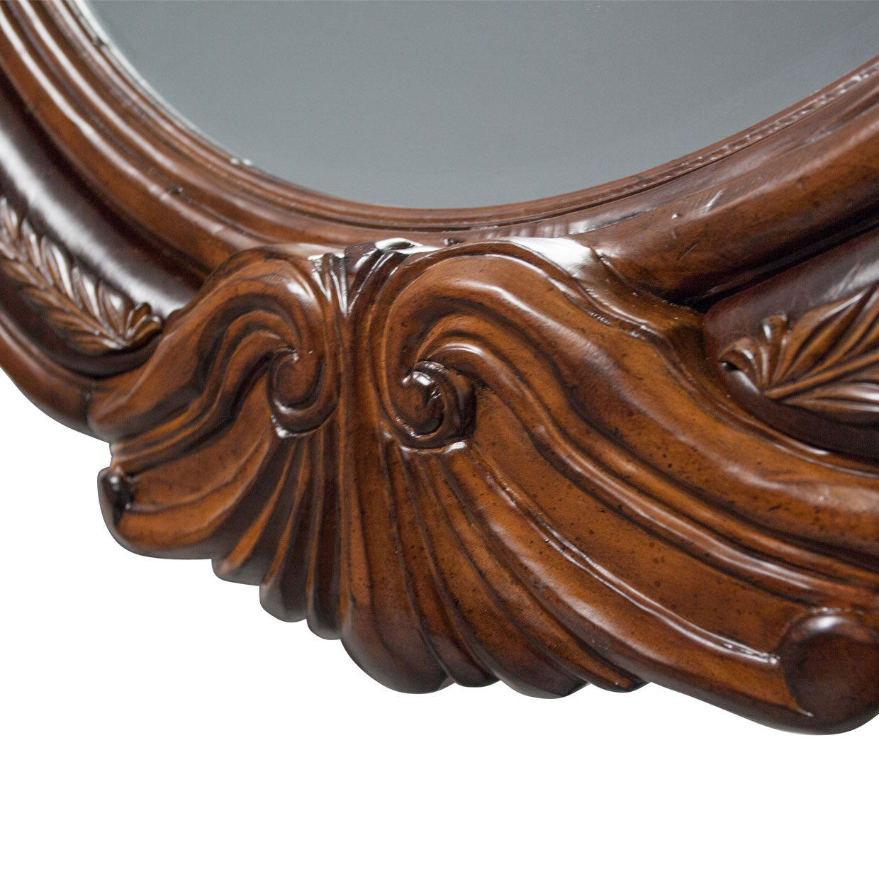 Graceful, curved and raised wood trim accents with delicate floral patterned corner carvings