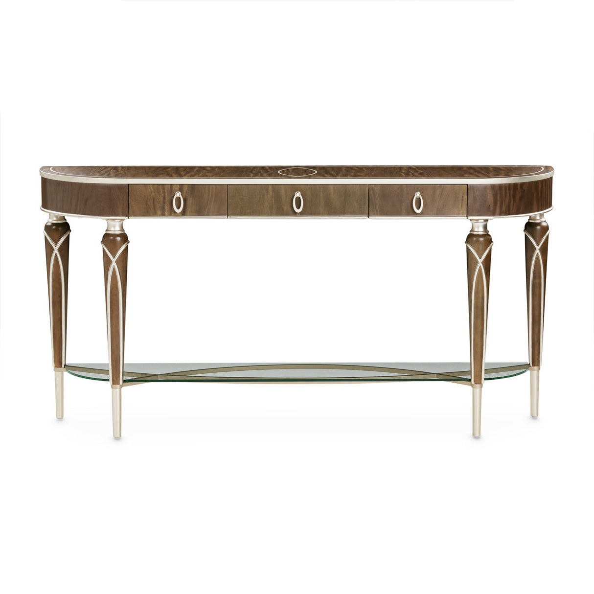 The Villa Cherie Console Table in Hazelnut finish by AICO blends decorative sophistication with practical elegance. Designed to elevate your entryway, hallway, or living room, this piece features a gracefully slim profile with three velvet-lined drawers for discreet storage. Beautiful Chardonnay-finished trim, hoop drawer pulls, and carved feet highlight the craftsmanship, while the tapered legs with crossed rope motif offer architectural charm and balance.