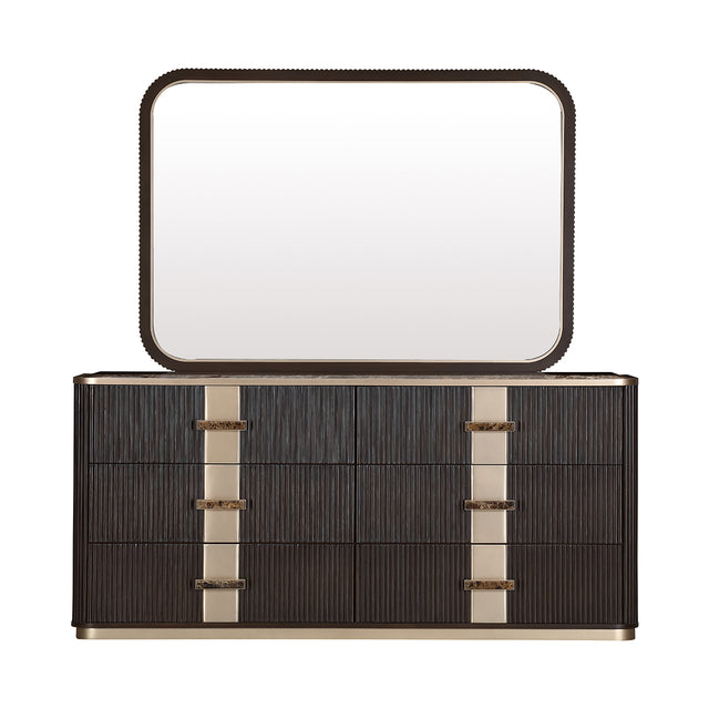 This set includes one West Kensington Dresser with six velvet-lined, soft-close drawers and an Emperador marble veneer top, plus one matching mirror framed in espresso-finished reeding with gold trim. The dresser features motion-activated lighting in the top drawers and a hidden compartment in the right drawer for secure storage.