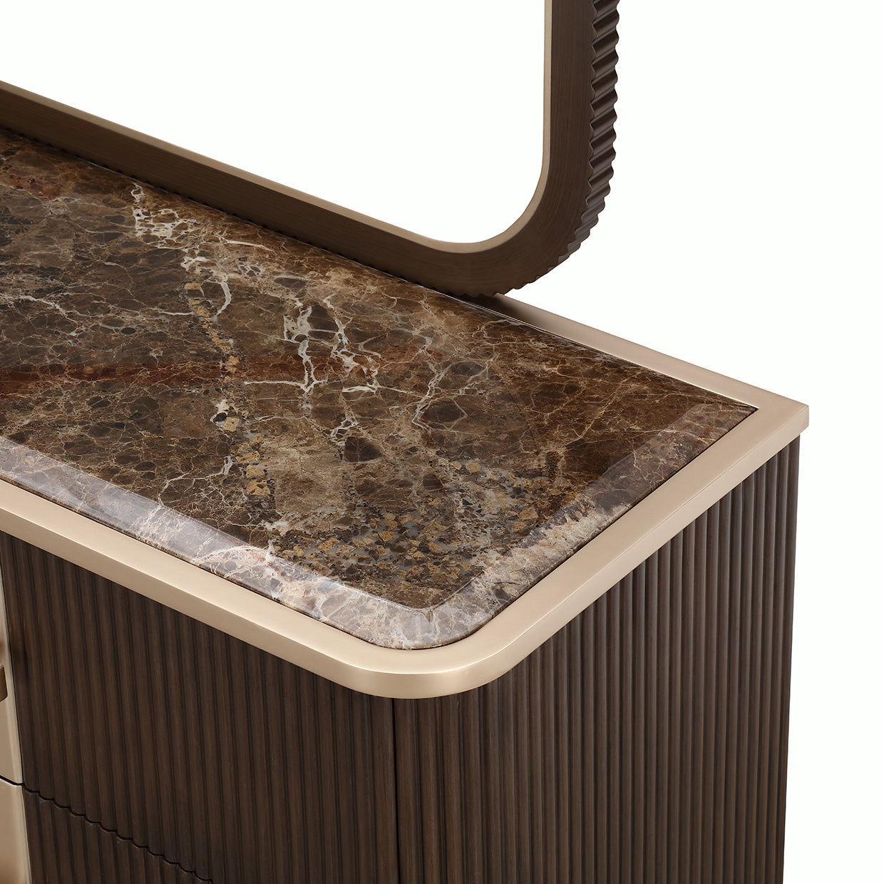 The West Kensington Dresser & Mirror Set is crafted from rubberwood in a deep medium espresso finish, creating a warm and sophisticated foundation. Wire-brushed oak veneers introduce organic texture and depth, enhancing the sculptural reeding across the case and mirror frame. A luxurious Emperador marble veneer top adds refined elegance and contrast, while gold-toned accents and marble-inset hardware highlight the silhouette with a subtle metallic glow. Velvet-lined, soft-close drawers protect your belongings and reinforce the set’s elevated, boutique hotel–inspired feel.