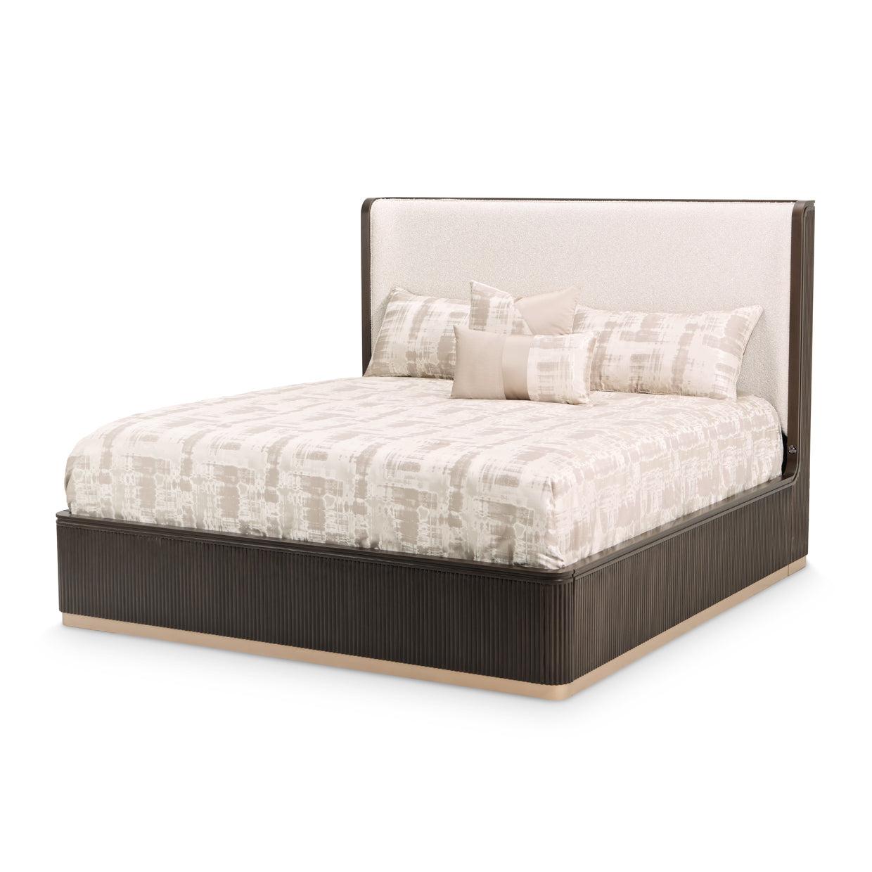 AICO by Michael Amini West Kensington Queen Bed combines exquisite craftsmanship with effortless luxury. Featuring a plush, multi-hued woven fabric headboard, this bed offers both comfort and elegance. The sculptural espresso frame with intricate reeding adds architectural depth, while the gold-trimmed base elevates the design. Built-in USB ports offer modern convenience without compromising its sophisticated aesthetic.