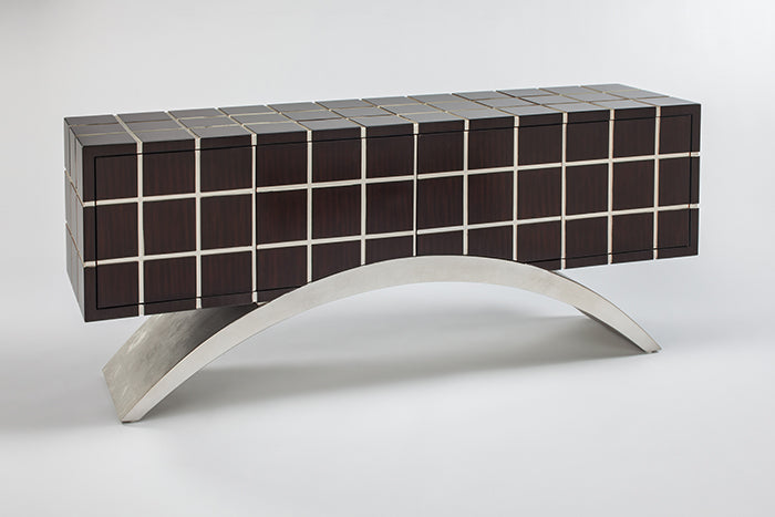 Perfect for living rooms, dining rooms, and entryways, this cabinet blends rich texture with modern contrast. The square checker motif and silver base create a sculptural presence, making it an eye-catching centerpiece in curated spaces.