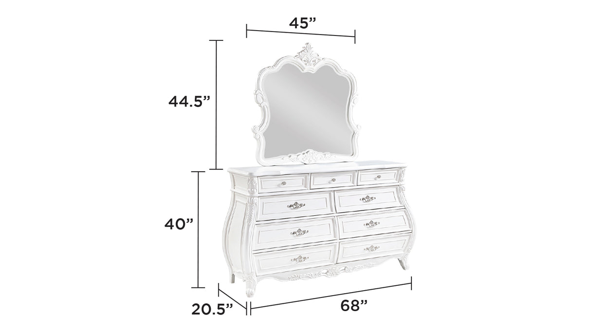- Elegant Mirror: Complementing the dresser, the elegantly carved mirror boasts a pearl finish.
