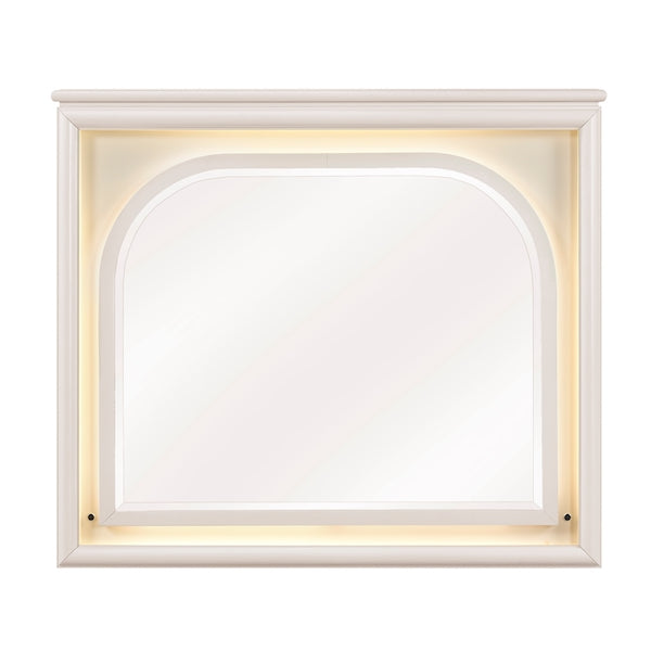 Transform your bedroom into a sophisticated, tech-enhanced retreat with the 2451 Collection. Crafted from wood and engineered wood with a crisp white finish and subtle embossed panel detailing, this collection balances sleek aesthetics with everyday functionality. The platform bed features a chenille upholstered headboard illuminated by advanced COB LED lighting for an ambient glow, while the footboard integrates two dovetail storage drawers with smooth ball-bearing glides. Coordinating case pieces, including a USB-A and USB-C nightstand, six-drawer dresser, COB-lit mirror, and five-drawer chest, complete this modern statement ensemble. Every detail — from chrome tone bar pulls to premium joinery — reinforces luxury, convenience, and durability in one elegant package.
