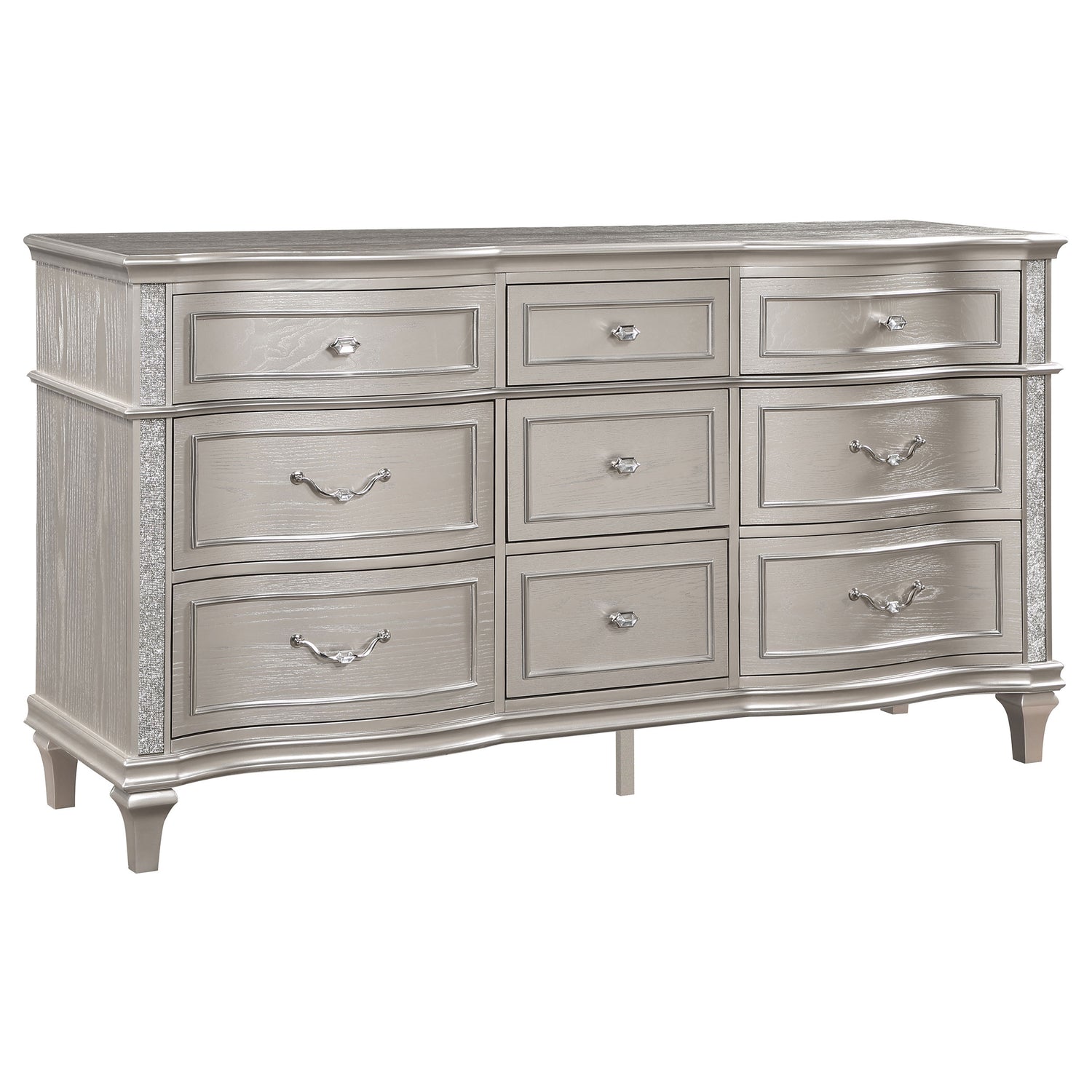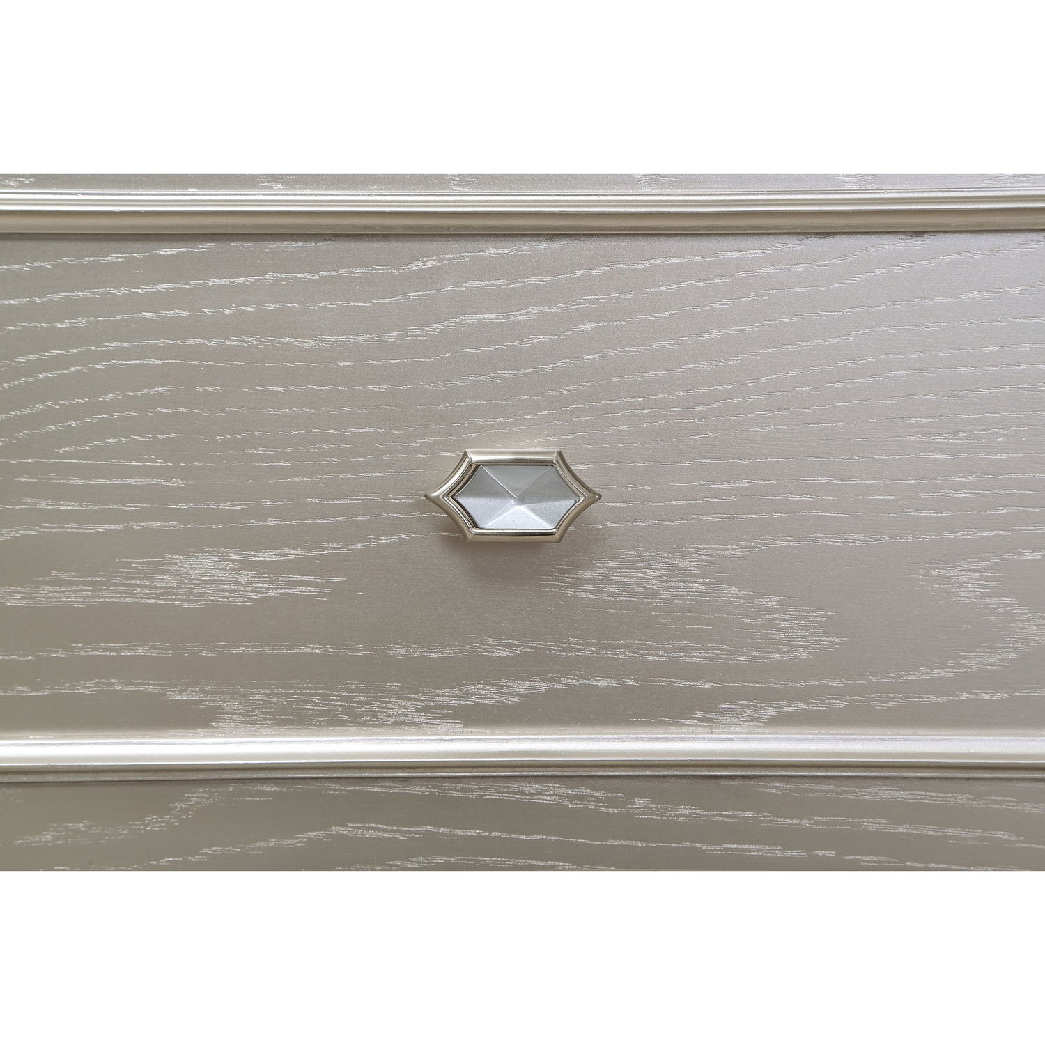 - Silver oak finish paired with glimmering accent panels delivers an elegant, modern look that adds a glamorous finishing touch