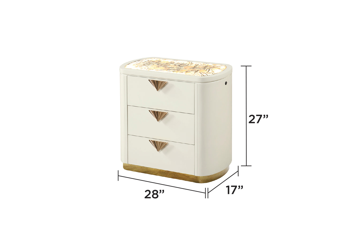 - Dresser, chest, and nightstand feature spacious drawers with distinctive metallic handles.