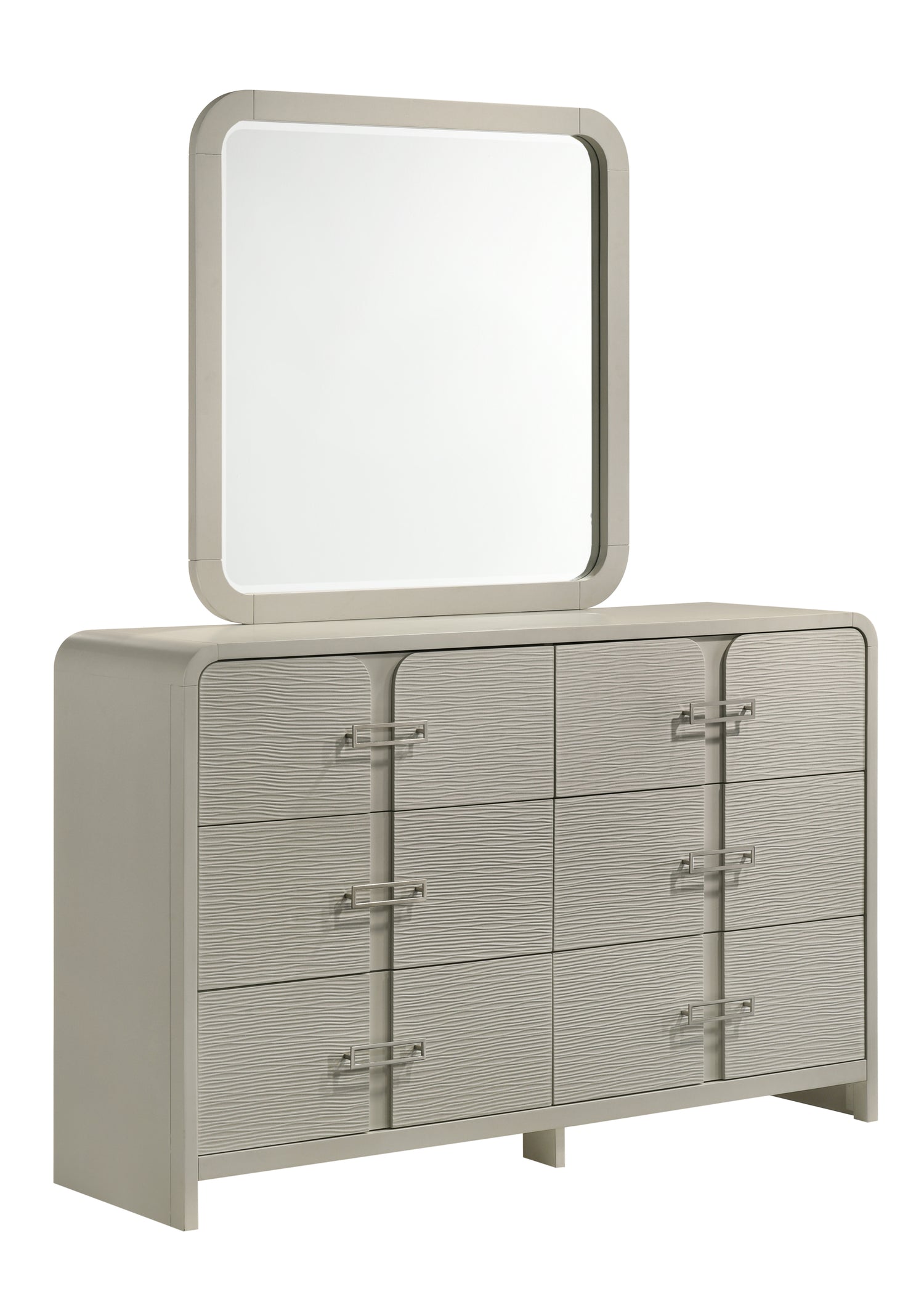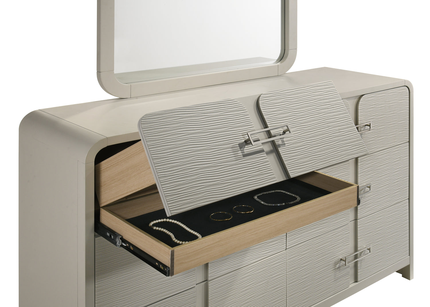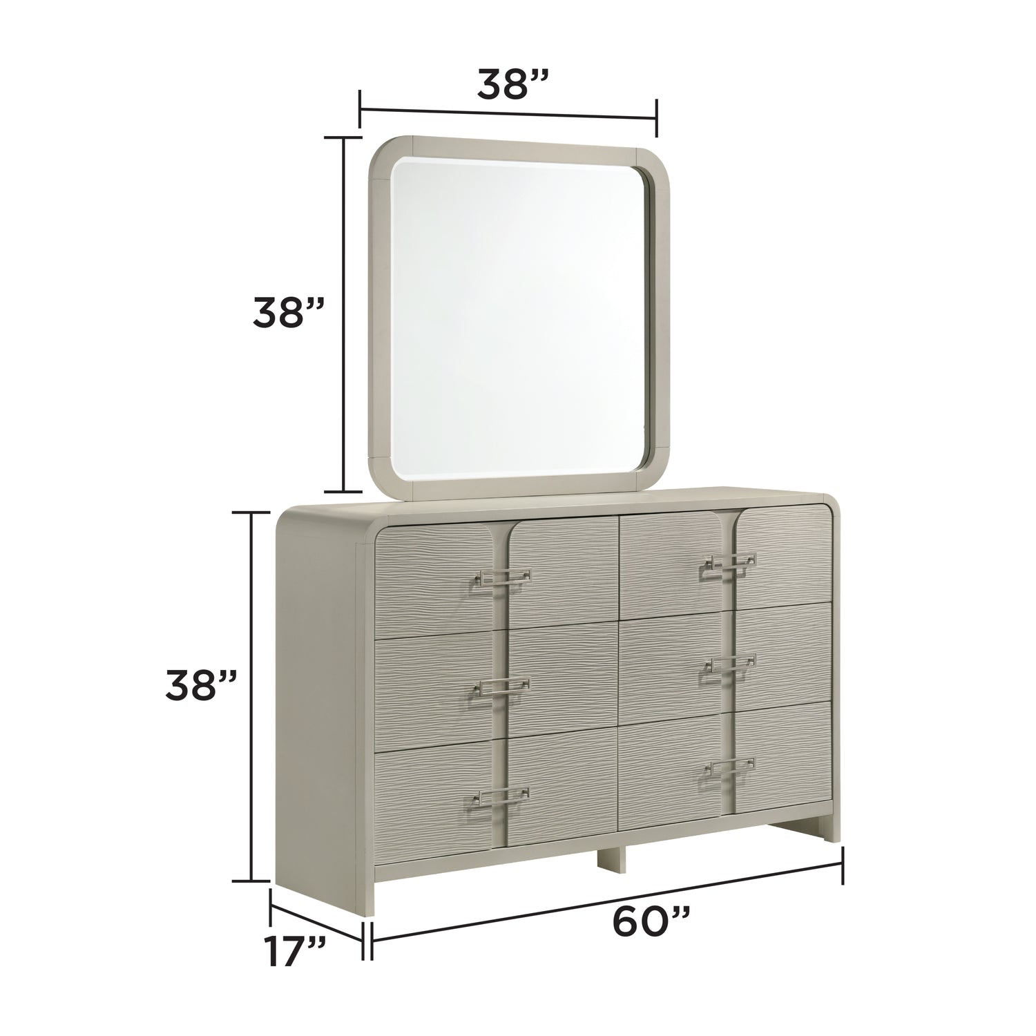 The Aria Bedroom Set combines modern elegance with practical functionality. Crafted from MDF and rubber wood, this set features a sleek Beige finish that adds warmth and sophistication to any bedroom. Each piece is designed with clean lines, textured drawer fronts, and premium hardware for a contemporary look. Smooth ball bearing glides ensure effortless drawer operation, while the sturdy construction guarantees durability. Includes bed, dresser, mirror, and nightstand and chest.
