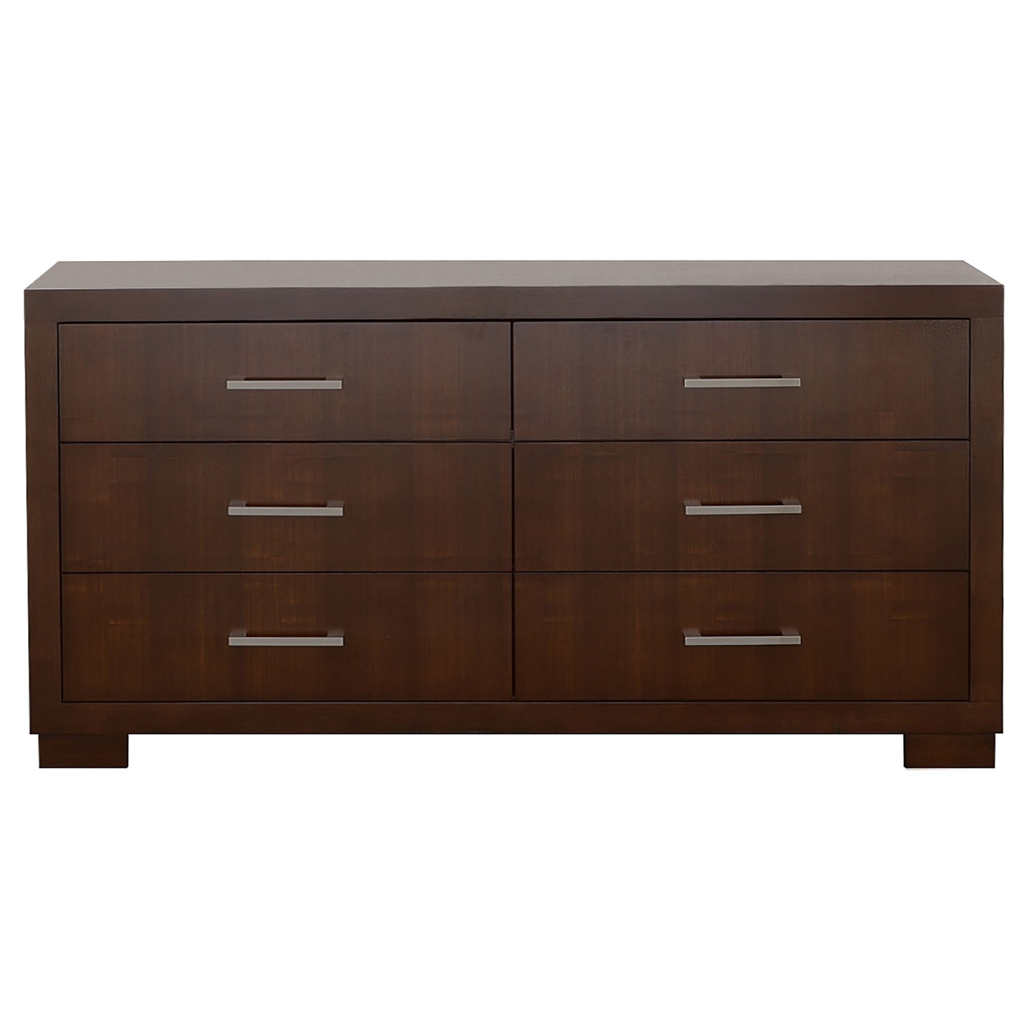 Modern and minimalist, this bedroom set creates a comfortable bedroom space with plenty of function and linear silhouetting. Beautifully finished wood pieces add a richness with clean lines, silver tone hardware, and felt-lined drawers, as a wide headboard and platform bed base maintain the ease of design noted in a modern era.