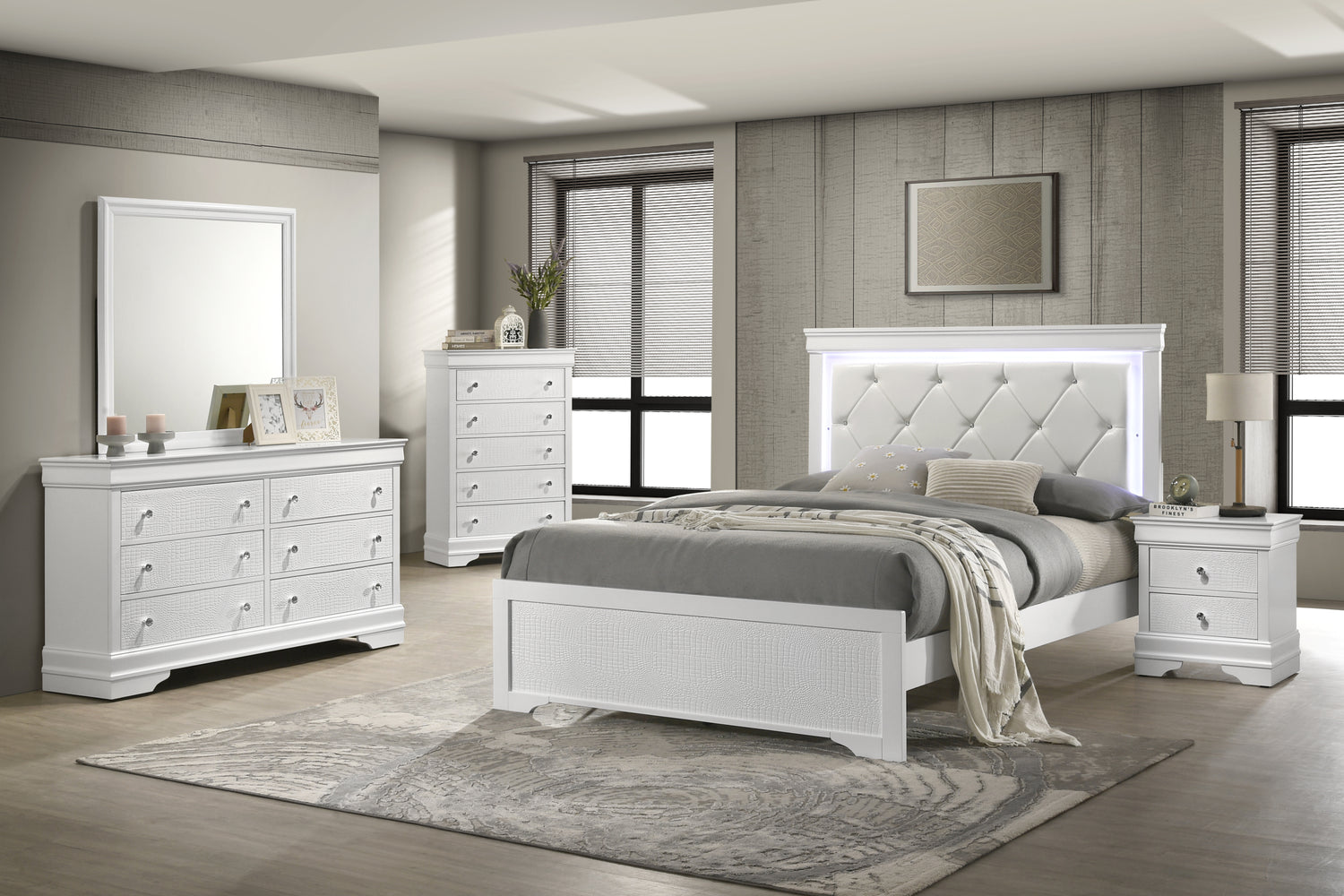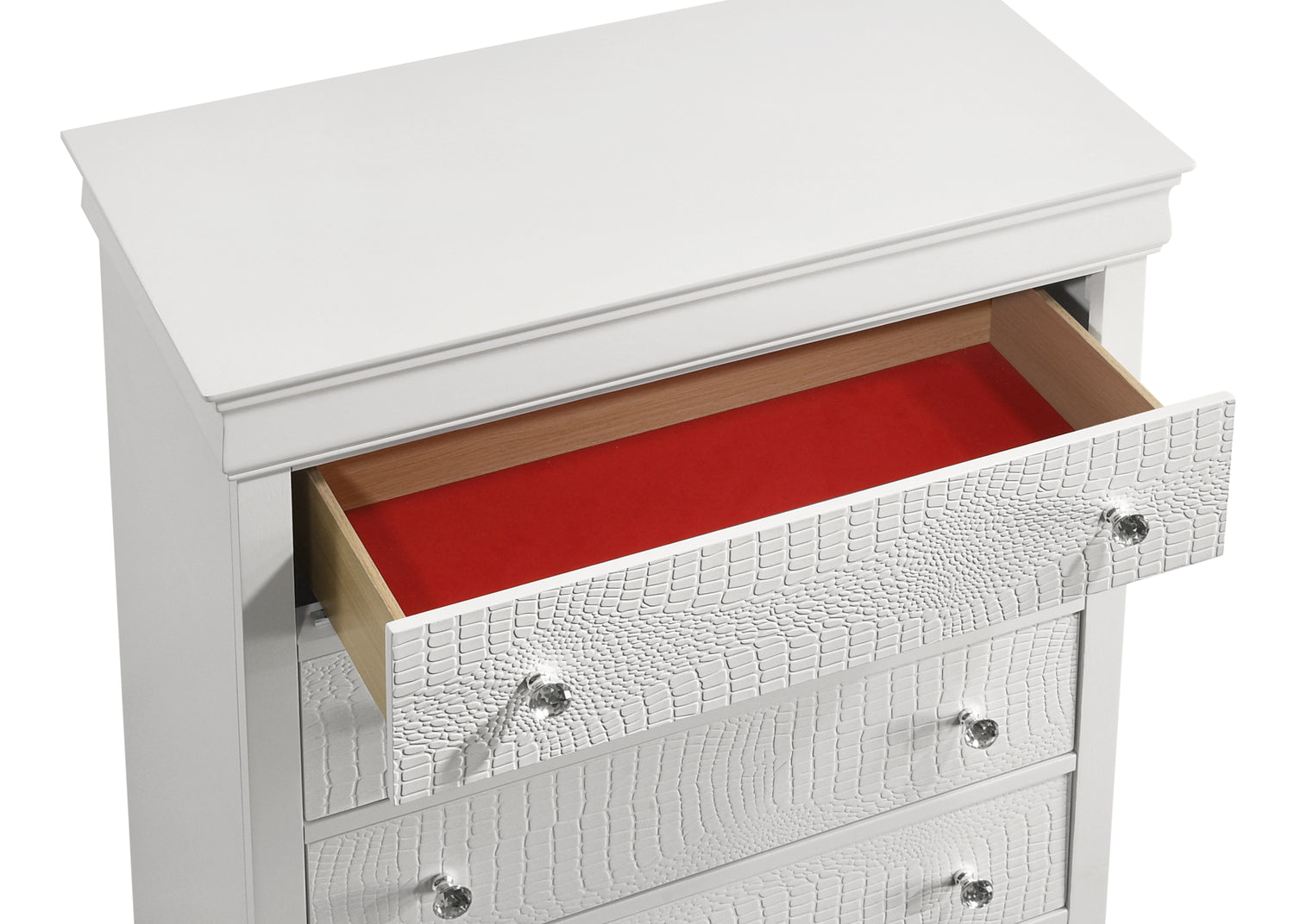 - Luxurious Touches: The bed boasts an upholstered tufted headboard with LED lighting, while the top drawers of the dresser, nightstand, and chest are lined with red velvet.
