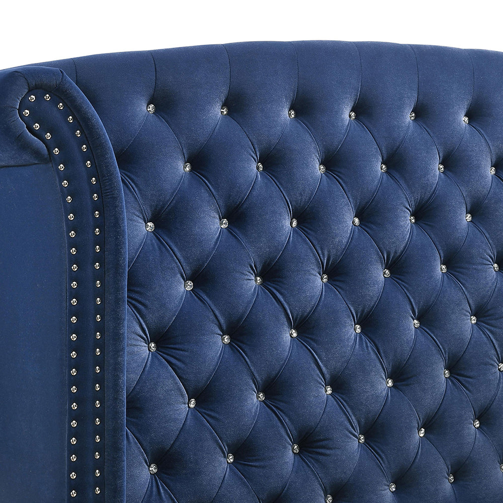 - Four-piece bedroom set features a dramatically large wingback headboard with button tufting and elegant nail head trim details