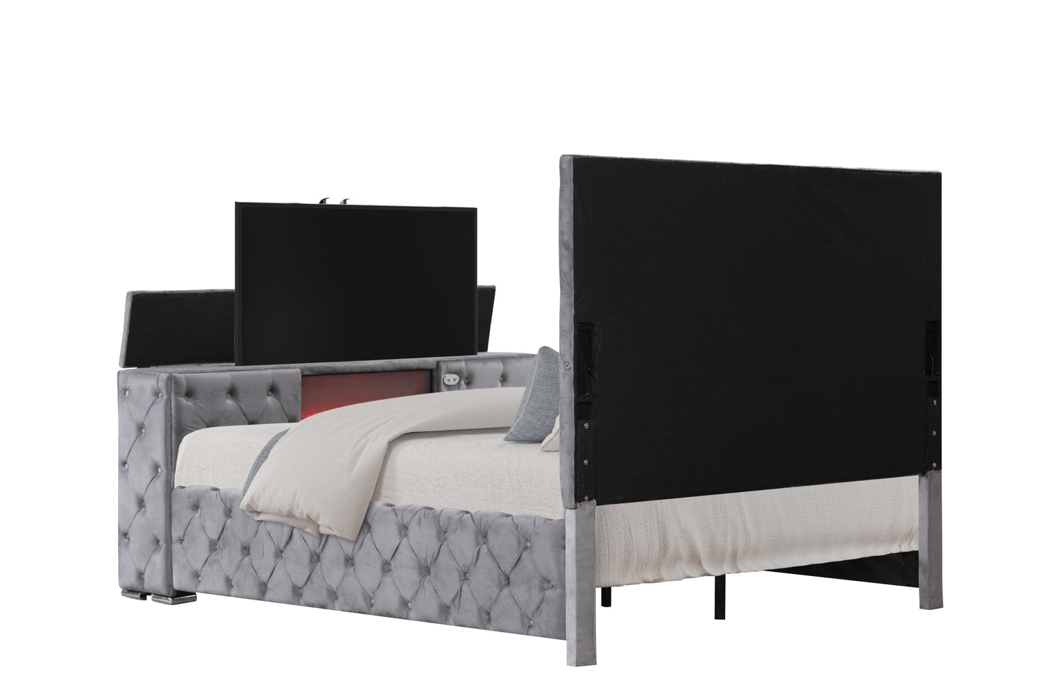 - Bed features built-in TV storage in the footboard (King size holds up to a 50-inch TV, Queen size holds up to a 43-inch TV; TV not included)