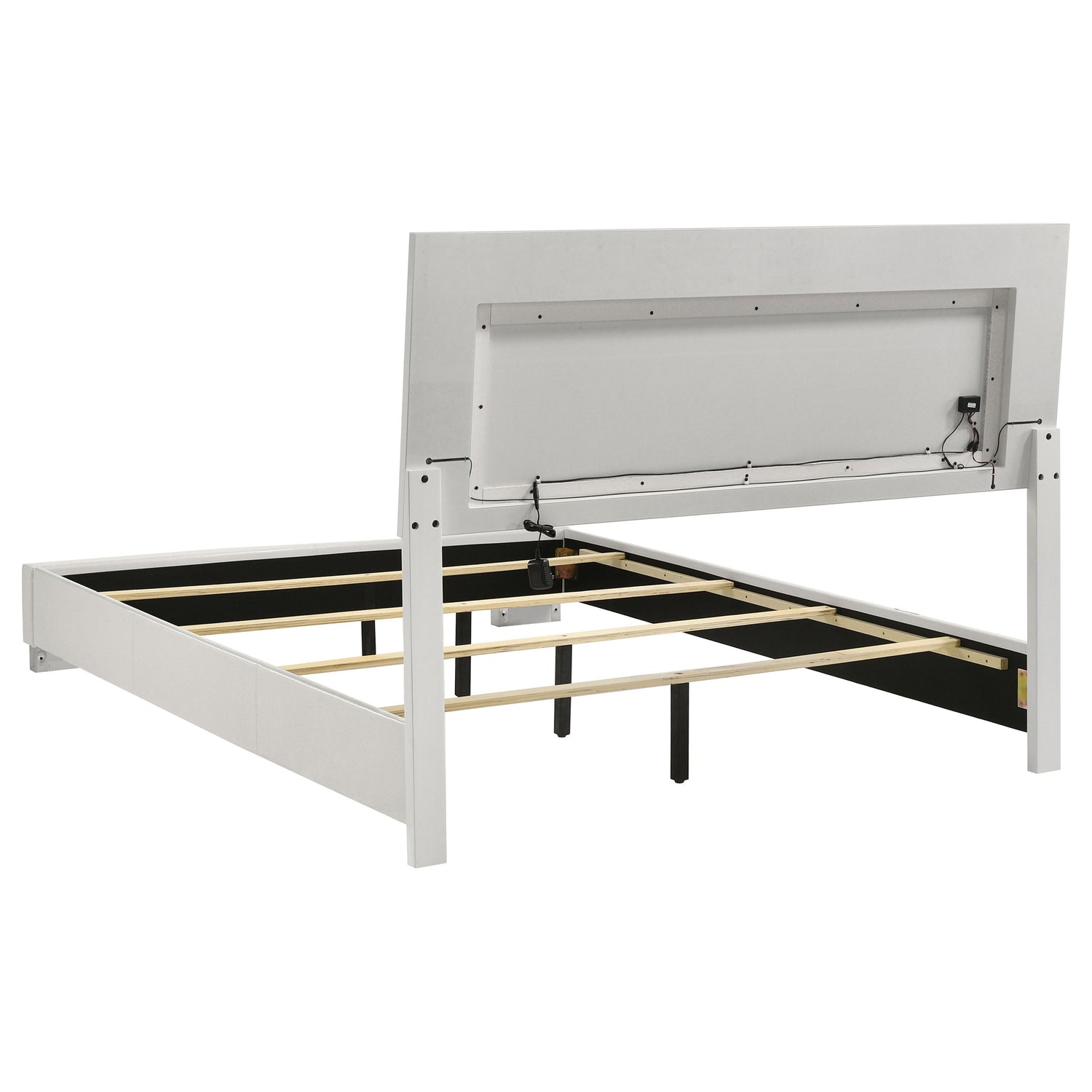 - Modern panel bed features integrated LED headboard lighting with a white high gloss finish and built-in blue LED light controlled by a touch switch