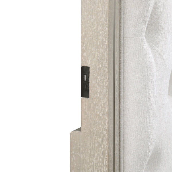This elegant bedroom suite features a button-tufted chenille headboard for plush comfort and two spacious ball-bearing-gliding storage drawers built into the footboard — perfect for linens and seasonal essentials. The integrated USB A & C charging ports keep your devices powered bedside.