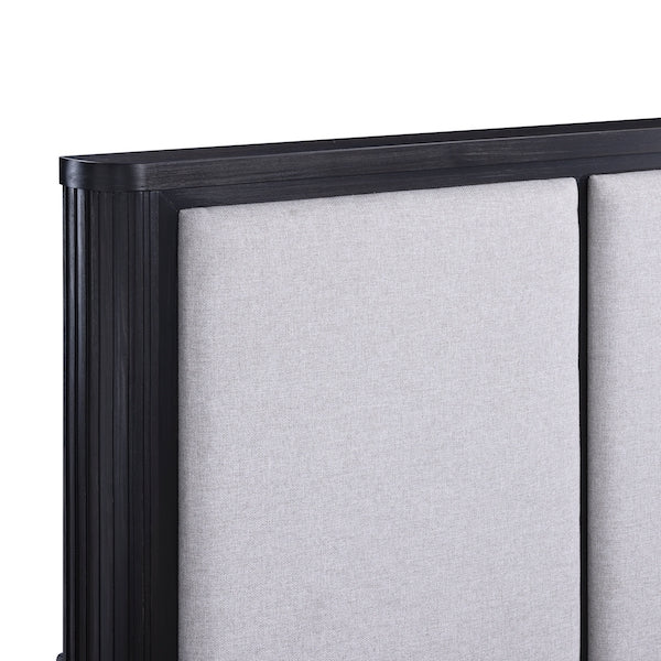 Designed to evoke understated glamour, the Gilbert Collection features clean geometric lines, rich charcoal oak veneer, and polished brass details that echo Art Deco sophistication. The platform bed showcases two upholstered headboard inserts in soft light-gray fabric for a striking contrast, while the footboard drawers provide hidden storage without sacrificing style. Coordinating case goods complete the ensemble with smooth-gliding dovetail drawers and timeless brass bar pulls—crafted for both functionality and enduring visual appeal.