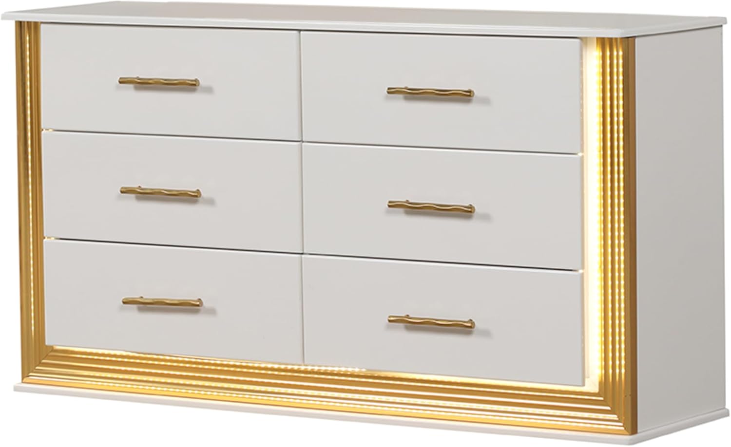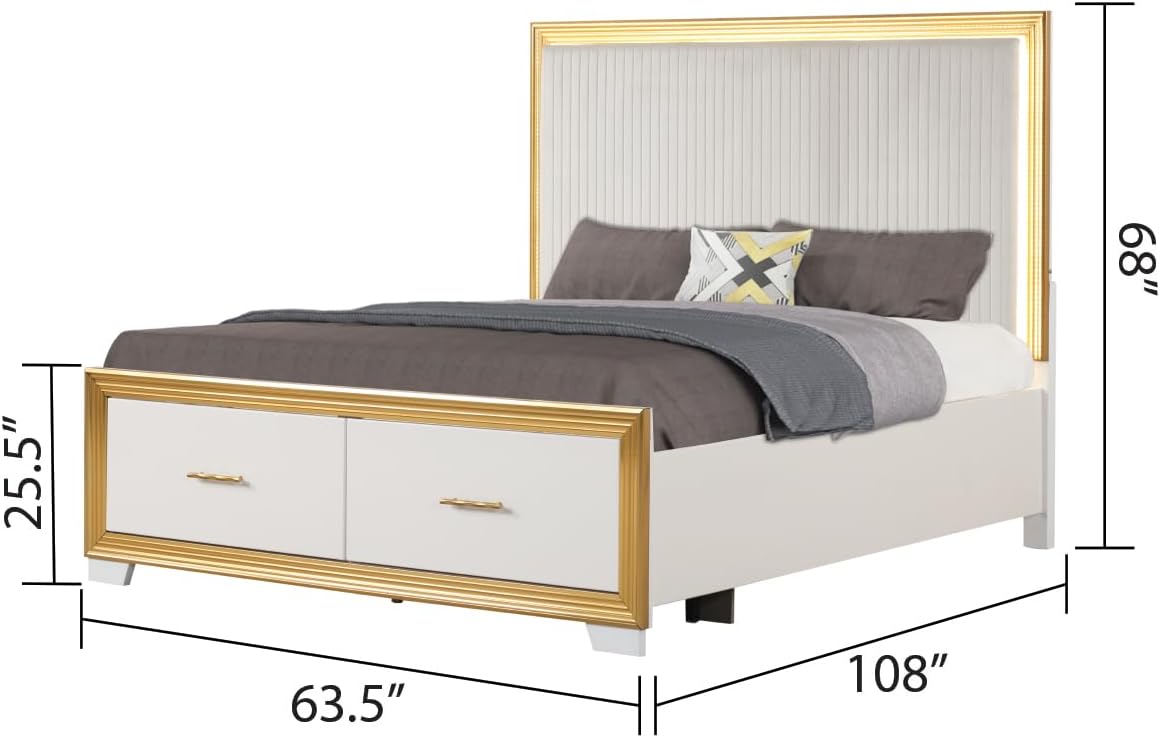 The Obsession Modern Storage Bedroom Set in white and gold redefines luxury and functionality for contemporary bedrooms. This set features a bed with a tufted headboard with LED accent lights and a footboard equipped with a deep storage drawer for added practicality. Crafted from a blend of solid and manufactured wood, each piece showcases a sophisticated gold finish that beautifully complements the weathered white sur faces, adding a touch of opulence to your bedroom decor.