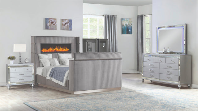 Lavish Modern Style 4 Pc King Bedroom Set Made with Fireplace in Headboard & TV stand in Footboard with Wood in Grey(CA INVENTORY)