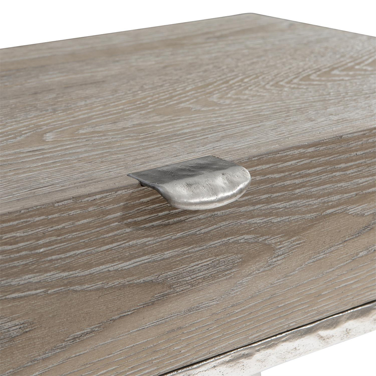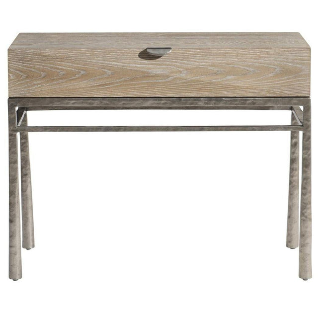 The Aventura Nightstand by Bernhardt blends Marcona-finished wood with a textured Frosted Nickel aluminum base for a modern rustic look. A dimensional pyramid drawer front, tapered legs, and optional USB charging inside the drawer add stylish functionality to this unique bedside table.