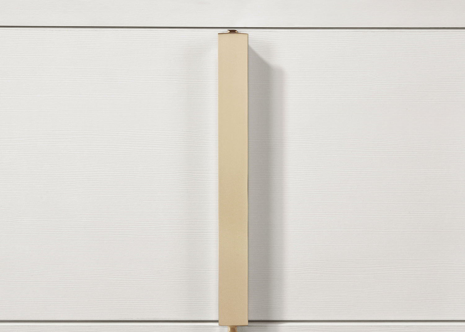 - Wood products construction with versatile finish and gold finish metal accents for geometric linear effect