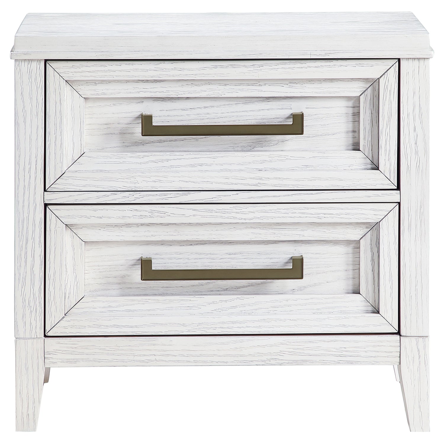 Bring fresh perspective to your bedside with a modern two-drawer nightstand. Its casual style and classic stance create a restrained look and feel, perfect for a soothing bedroom space. It features a distressed white finish over wood grain, creating subtle depth and detail. Drawers are roomy for bedside essentials, and stepped fronts add character and dimensionality. Contrasting antique brass toned bar pull complete the look, offering stylish allure in your stylish bedroom.