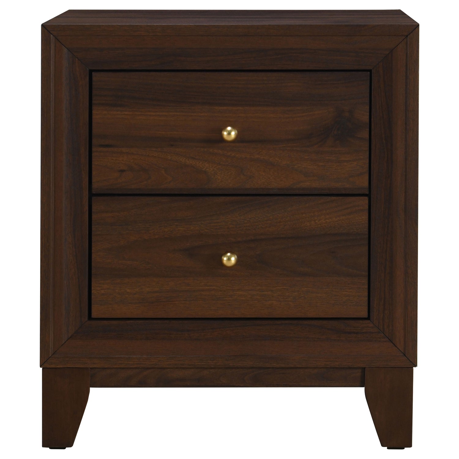 Introduce a sense of richness and depth to your bedside with a modern two-drawer nightstand. Crafted in durable laminate with a walnut finish, it lends warmth and stylish flair. A pair of drawers create ample space for bedside essentials, everything from personal items and charging cables to books. The front of the case features mitered trim, while tapered block legs add lightness to its presentation. Petite gold finish round knobs add a touch of contrast and elegance, perfect for a refined bedroom.