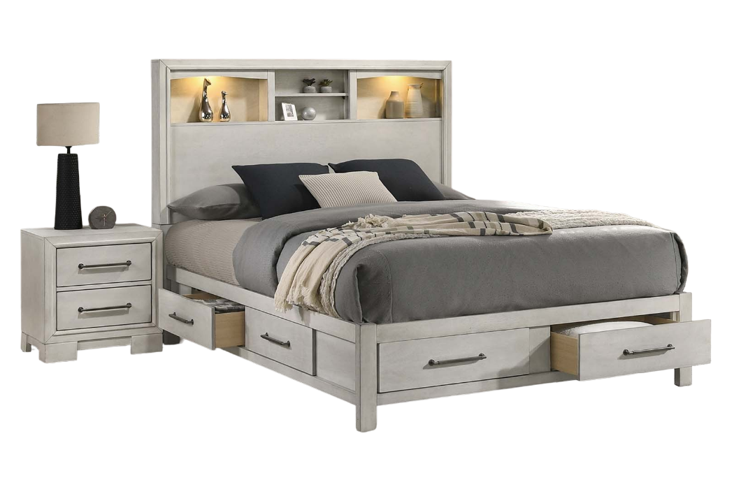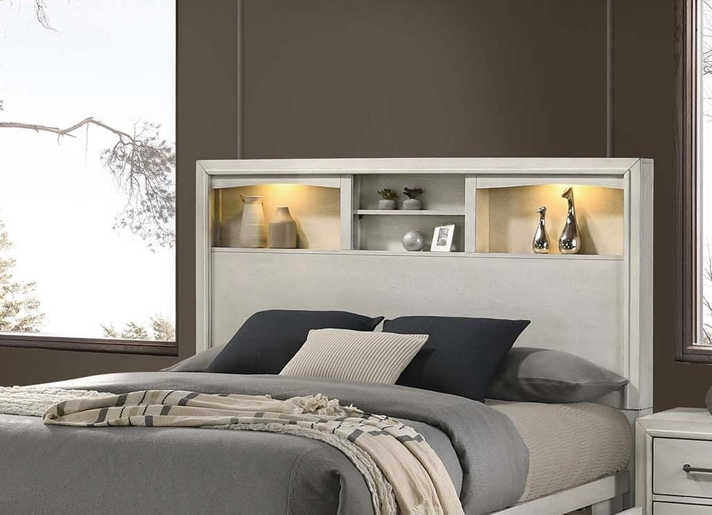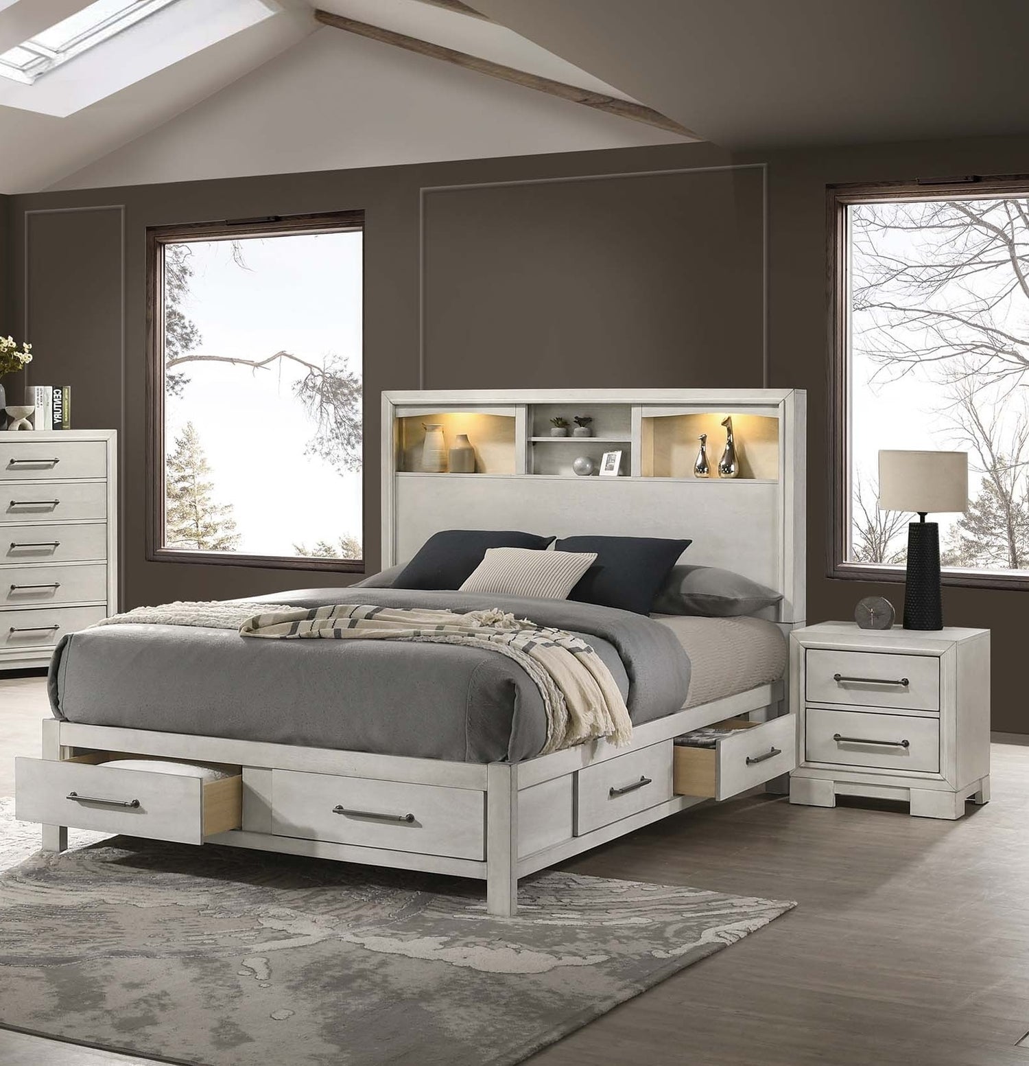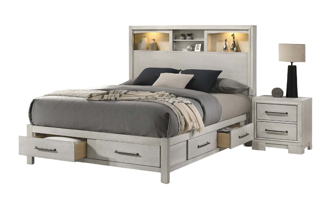 Modern Transitional Style Eastern King Size 1pc Bed Smooth Gliding Drawers Metal Handles Built In Lights Open Headboard Shelves Antique White Finish Bedroom Furniture is available