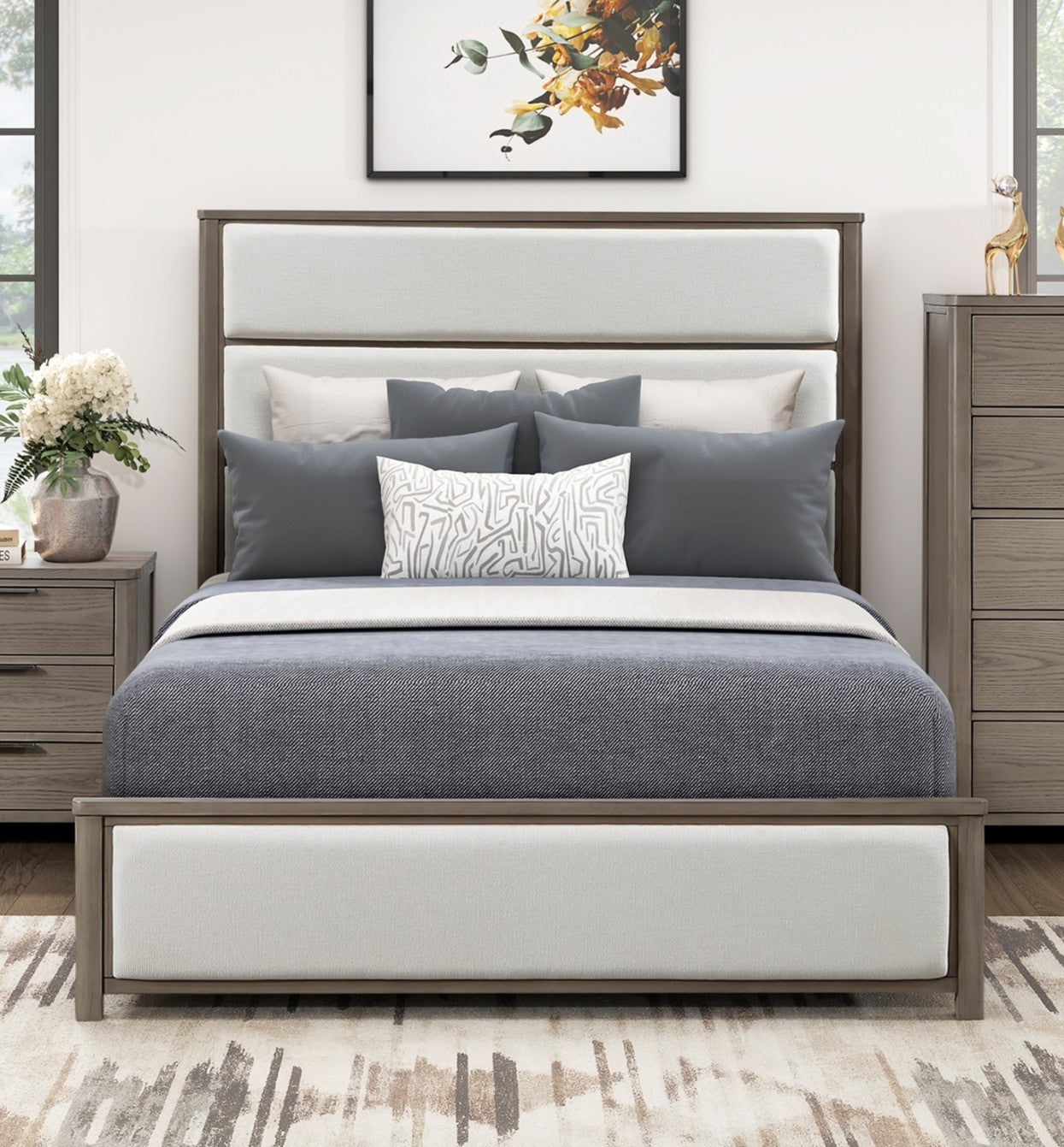 Introduce luxury and serene style into your bedroom with this sophisticated Queen panel bed, a beautiful blend of wood finish and plush fabric comfort. The frame is constructed from a durable mix of wood, engineered wood, and high-quality oak veneer, featuring a contemporary light gray finish that provides a fresh, modern foundation. The headboard and footboard are elegantly enhanced with soft, textured chenille fabric upholstery in a neutral beige tone, adding warmth and a refined look to the frame. This complete bed set includes the headboard, footboard, and rails, establishing a tranquil centerpiece that is ready for your required foundation or box spring and mattress.