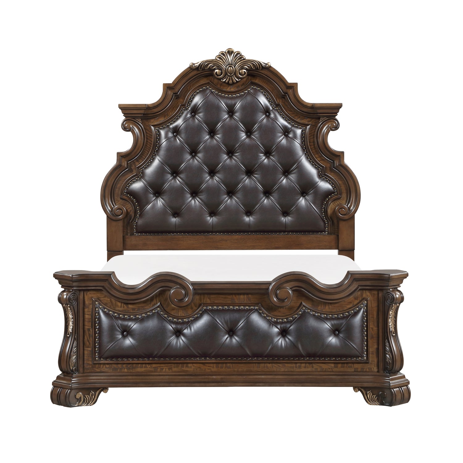 - Faux leather upholstered headboard and footboard with button tufting and nailhead trim