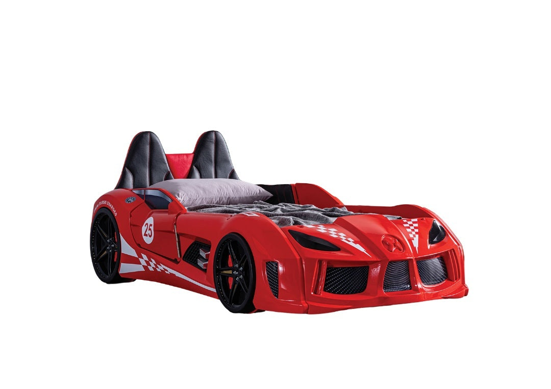 Red Finish Twin Size Race Car Design Bed Modern Novelty Style Attached Two Magnetic Doors With LED Lights On Wheels And Bottom Upholstery Headboard And Sides is available