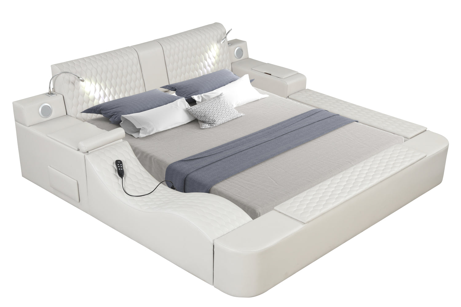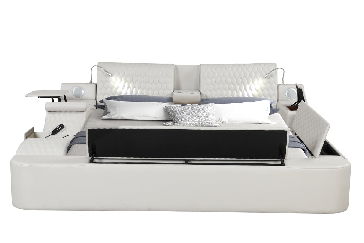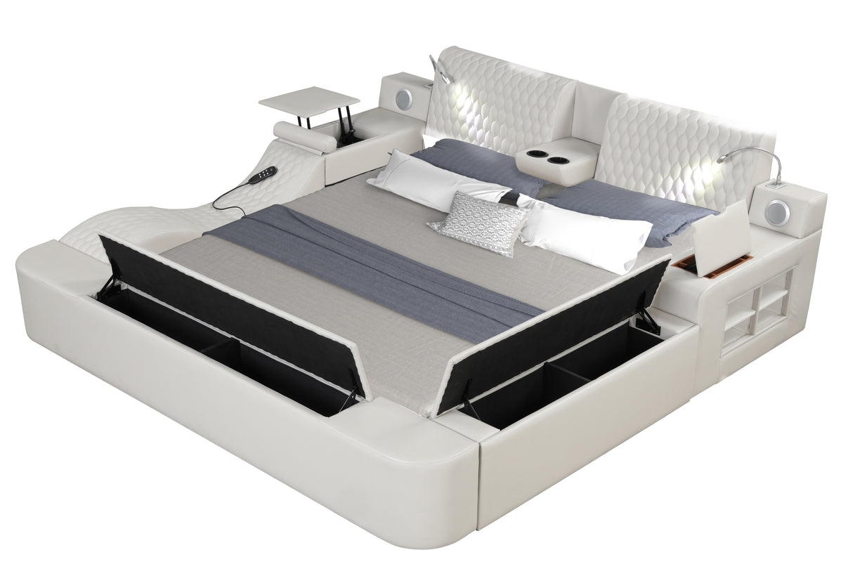 This futuristic bed is the ultimate enclosure system with everything you need in a room, ALL IN ONE. This ultra-urban design is a perfect choice to distinguish your bedroom. Massage, speakers, reading lights, storage, comfort, This bed has it all. If you want to enjoy a massage in your bedroom, the remote-controlled massage chaise attached will undoubtedly bring a fantastic experience. The side rails' side storage box and drawer storage are incredibly convenient for storing books, magazines, or any other essentials. The built-in Bluetooth speakers are suitable and can lighten up your mood on demand. With a built-in charging station that plugs USB hookups, you no longer need to leave the bed! The reading lights on both sides of the bed will accompany you for your late-night study or reading sessions with your significant other. The headboard is padded and cushioned for maximum comfort. The frame is made of engineered wood for long-lasting quality. This modern day adult playground is revolutionary for many reasons. Only make one purchase, and everything you need is at your disposal. Available in White/Black/Brown colors in King/Queen sizes.