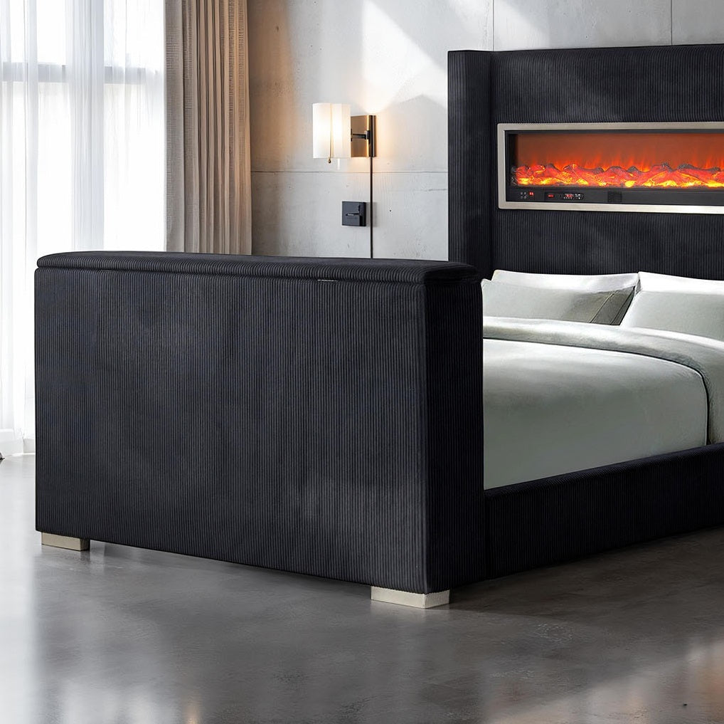 Product Description:- Transform your bedroom into a luxurious haven with this innovative modern bed. The frame offer lasting durability, and the footboard includes a TV lift. Designed for tech-savvy, style-conscious sleepers, this bed promises both function and flair—just add your favorite box spring and mattress... Product Dimensions:- Eastern King Size Bed - 83'W X 96'D X 67'H Listing Includes :- 1pc Eastern King Size Bed Only. DRESSER,NIGHTSTAND,MIRROR, CHEST- NOT INCLUDED. Simple assembly require. Product Features:- Contemporary Black Color Acacia Wood, Birch, Engineered Wood, Stainless Steel, Plastic No Heater on Fireplace - Flame Box Display Only 3D Fireplace Simulator w/ 13 Colors and 5-Level Adjustable Brightness on Headboard Stainless Steel Frame Footboard w/ TV Lift (EK: Up To 50 Inch, Q: Up To 50 Inch - TV not included) Wingback Design Headboard Bluetooth Audio USB and TF/Micro SD Card Ports Foundation Required.