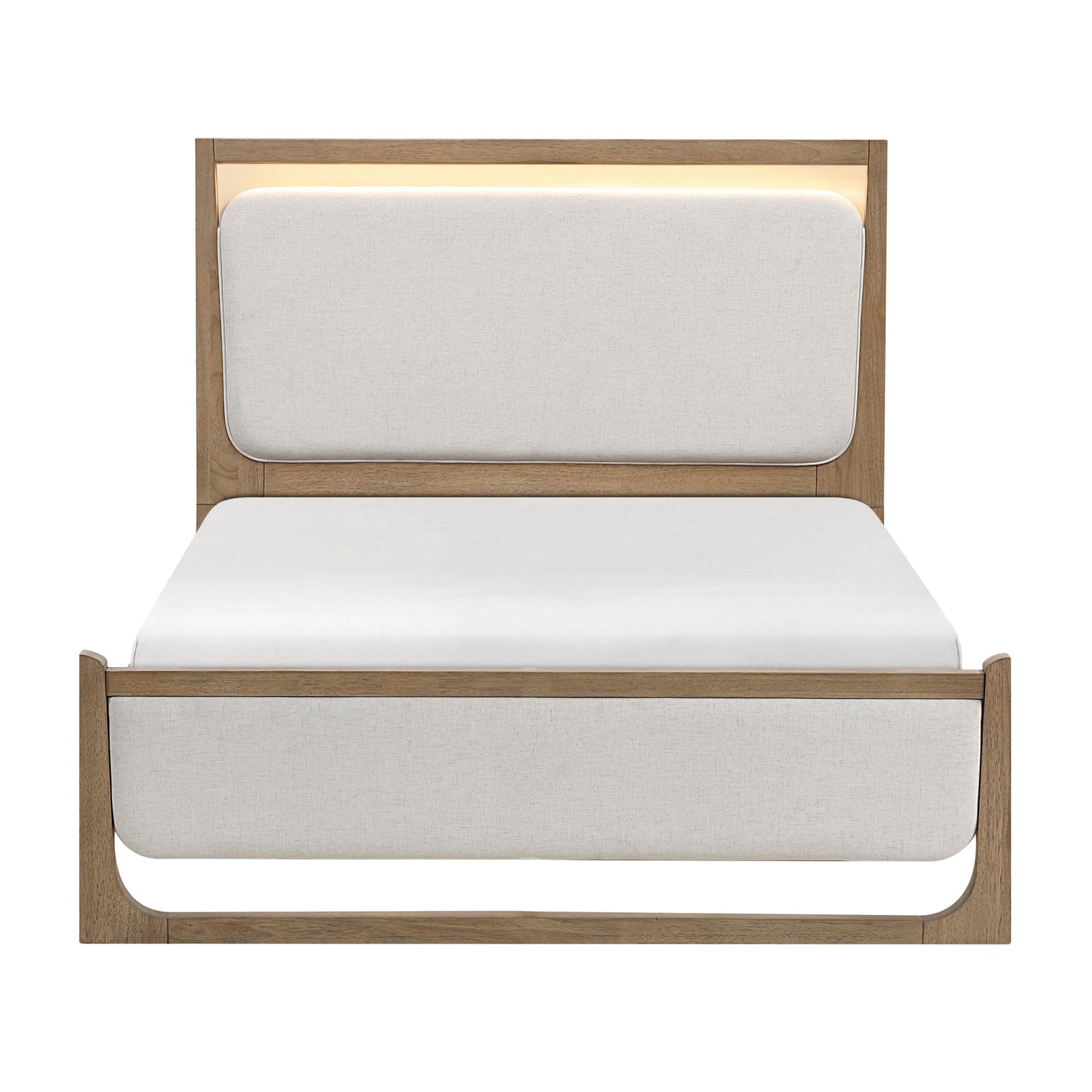 Elevate your bedroom's ambiance and style with this modern bed frame, featuring a striking combination of light brown wood and textured upholstered accents. Crafted from durable hickory veneer, wood, and engineered wood, this bed boasts a sophisticated design with a plush headboard and footboard. The integrated LED lighting in the headboard, controlled by convenient touch sensors, adds a warm glow, perfect for reading or setting a mood. This complete bed set includes the headboard, footboard, and rails, providing a sturdy and stylish foundation for your mattress. While assembly is required, the effortless blend of contemporary design, smart features, and quality construction makes this bed an ideal centerpiece for any modern sleep sanctuary (foundation/box spring required). Product Dimensions:- Overall Dimension: 63.5' x 87.5' x 54'H Headboard height: 54' Footboard height: 20' Rail to floor: 7' Listing Includes: One Queen Size Bed Only. Mattress: Not Included Simple Assembly Require
