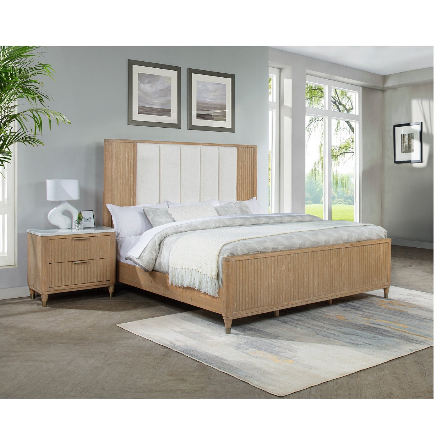 Transform your bedroom into a modern sanctuary with this sleek and sophisticated ensemble. Featuring clean lines and a natural finish, this group exudes understated elegance, seamlessly blending contemporary design with a touch of warmth. The centerpiece boasts a stylishly paneled headboard with textured accents for added visual interest.