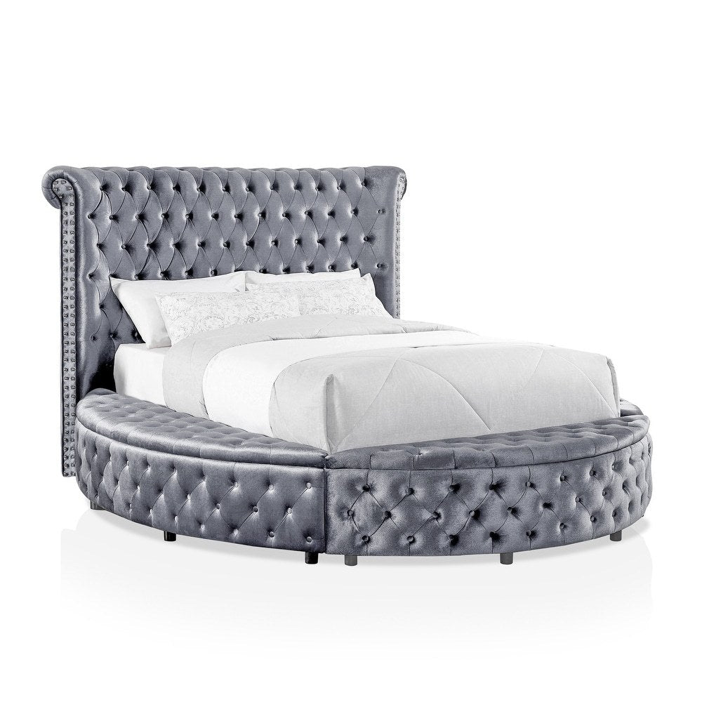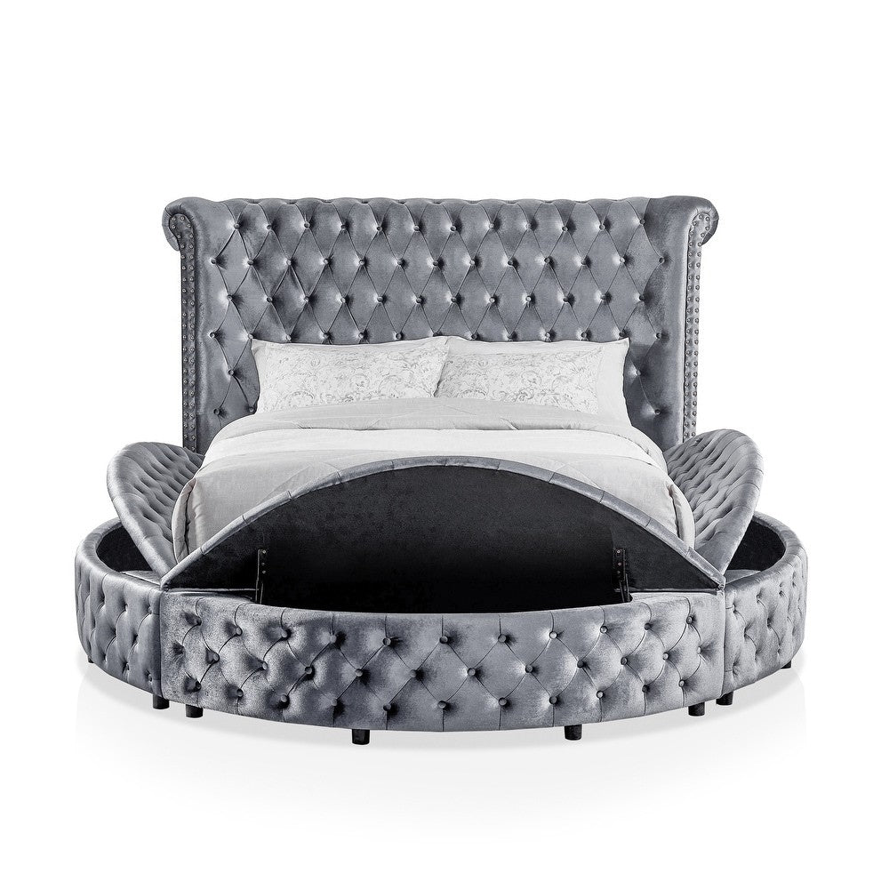 1pc Unique Round Glam Gray Velvet Like Acrylic Button-Tufted Detailing Storage Bed King Size is available