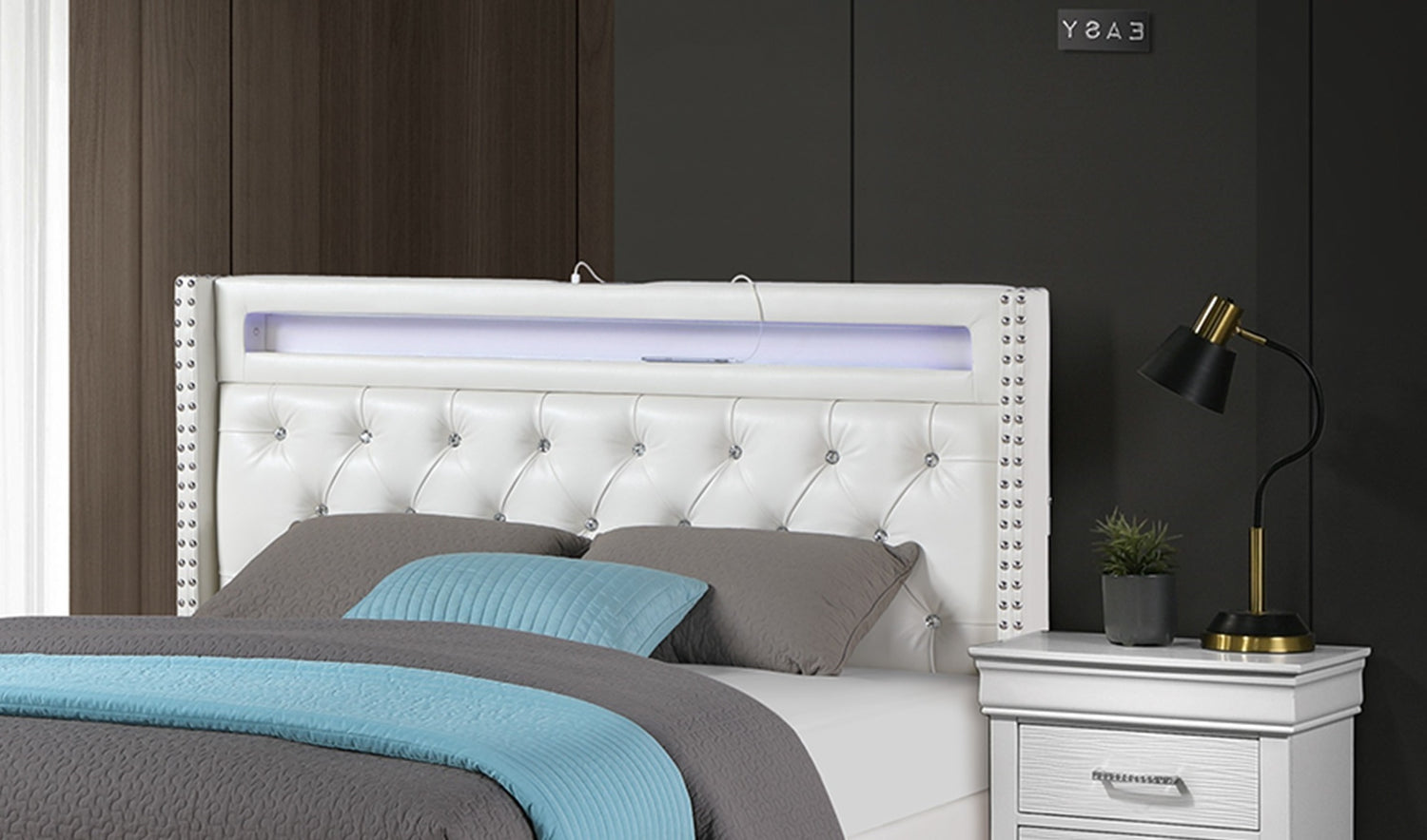 Designed to be the focal point of your bedroom, this fully upholstered faux leather Queen Bed, offers a sleek and sophisticated look. With a platform design that requires no box spring, it provides a sturdy and stylish foundation, making it both practical and visually appealing. The tufted headboard is adorned with sparkling diamond button accents, creating a dazzling effect that enhances the bed’s glamorous aesthetic. A carefully crafted nailhead trim along the sides of the headboard adds a touch of sophistication, framing the design with timeless charm. Whether you're sitting up to read or simply unwinding, the plush upholstery offers exceptional comfort and style. Bringing modern convenience to your bedroom, the headboard is equipped with built-in LED lighting that casts a soft.