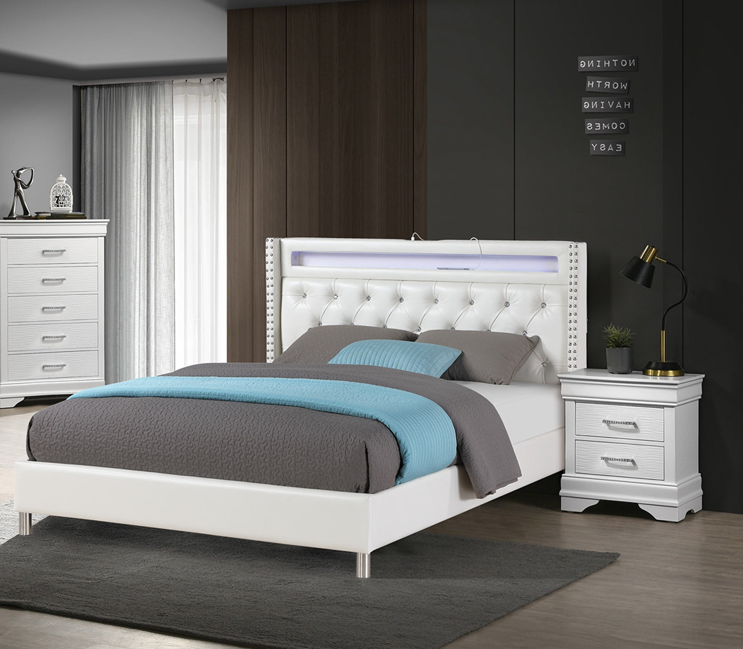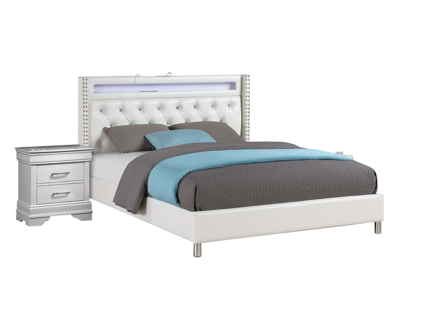 Modern Style Queen Size Bed LED Lights Charging Port Button Tufted Metal Legs White Finish Bedroom Furniture is available