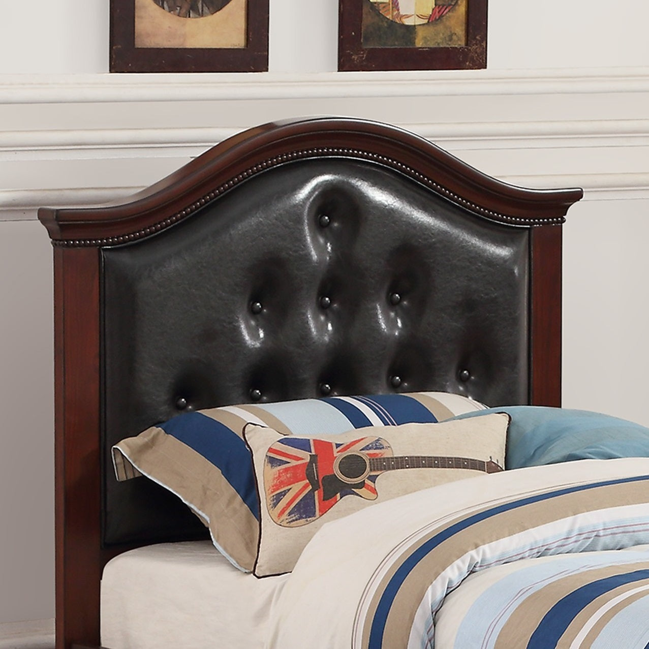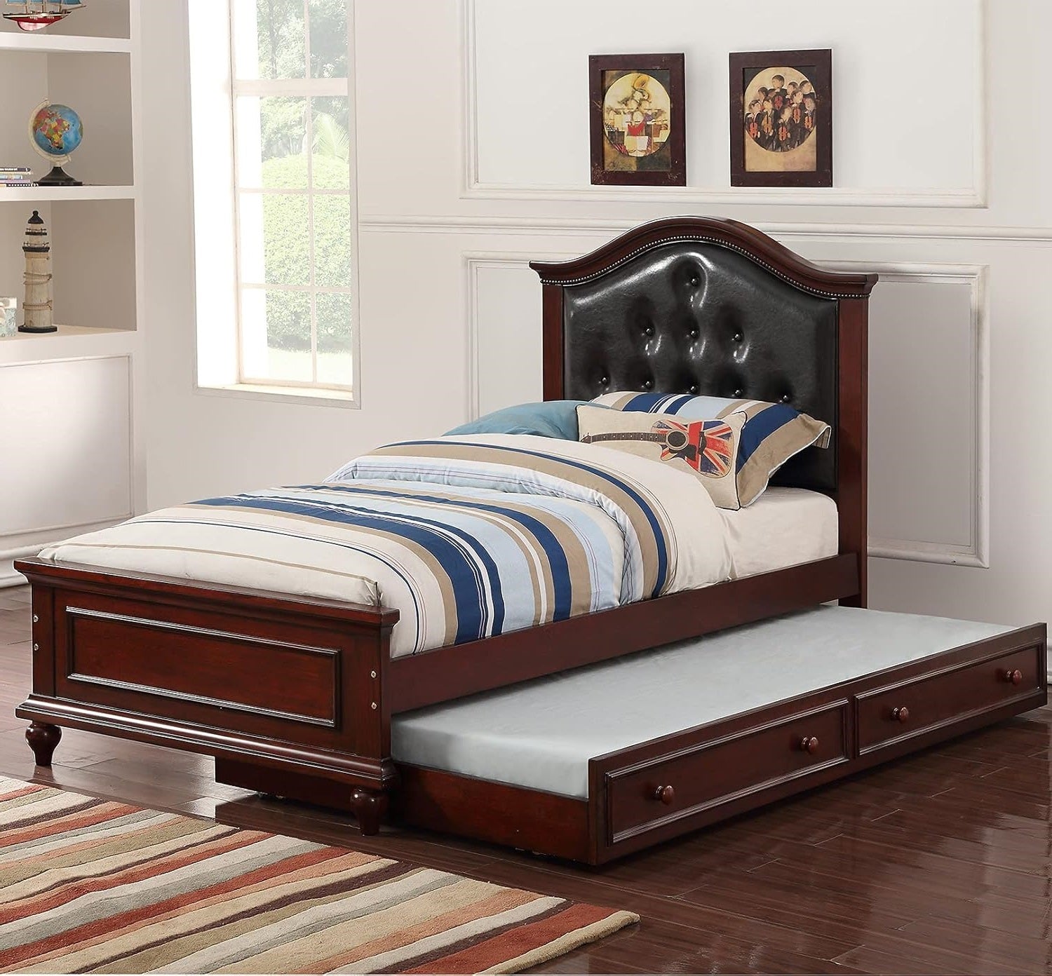 Contemporary Style Dark Cherry Twin Size Bed w/ Trundle Slats Pine Plywood Bedroom Furniture Black Faux Leather Tufted HB