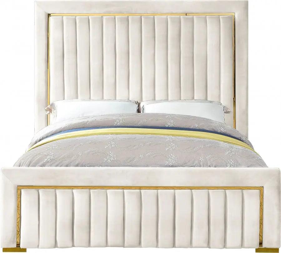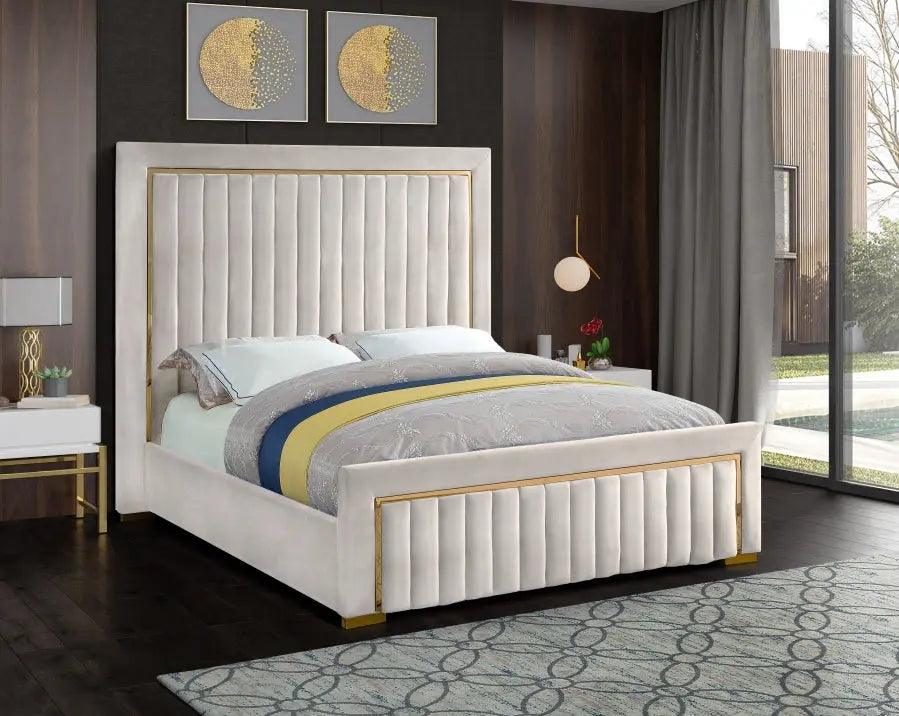 Ensconce yourself in regal modernity in this Dolce Velvet Bed. A super tall headboard makes this Dolce bed hard to ignore, ensuring it is the focal point in your bedroom sanctuary. The padded headboard is plump and welcoming, making it ideal for propping up against while you read the daily news or watch some TV. Gold trim and channel tufting add to the headboard's luxurious look, lending it an air of regality and upscale refinement. The velvet upholstery is buttery-soft and lavish to the touch, making you feel like royalty with every nap.