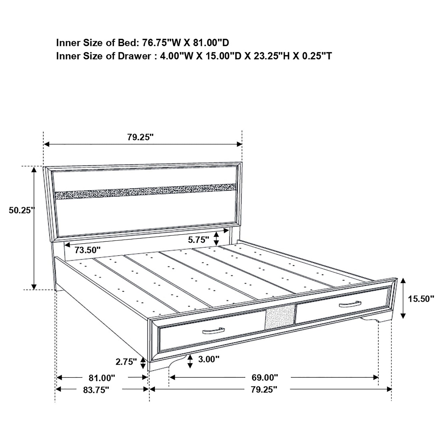 Eastern King Storage Bed: 79.25"W x 83.75"D x 50.25"H
