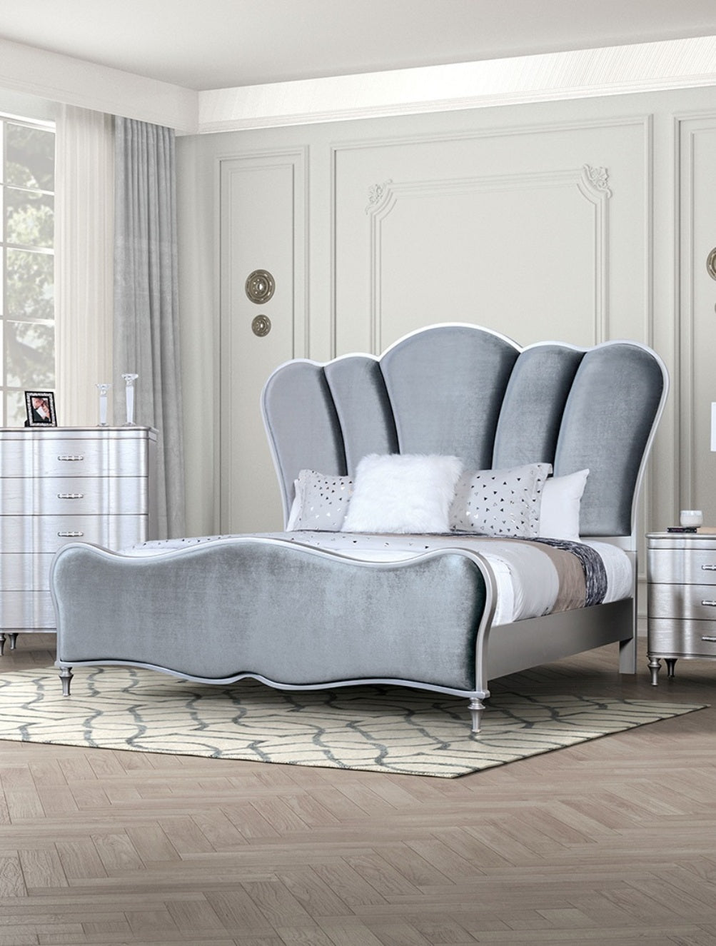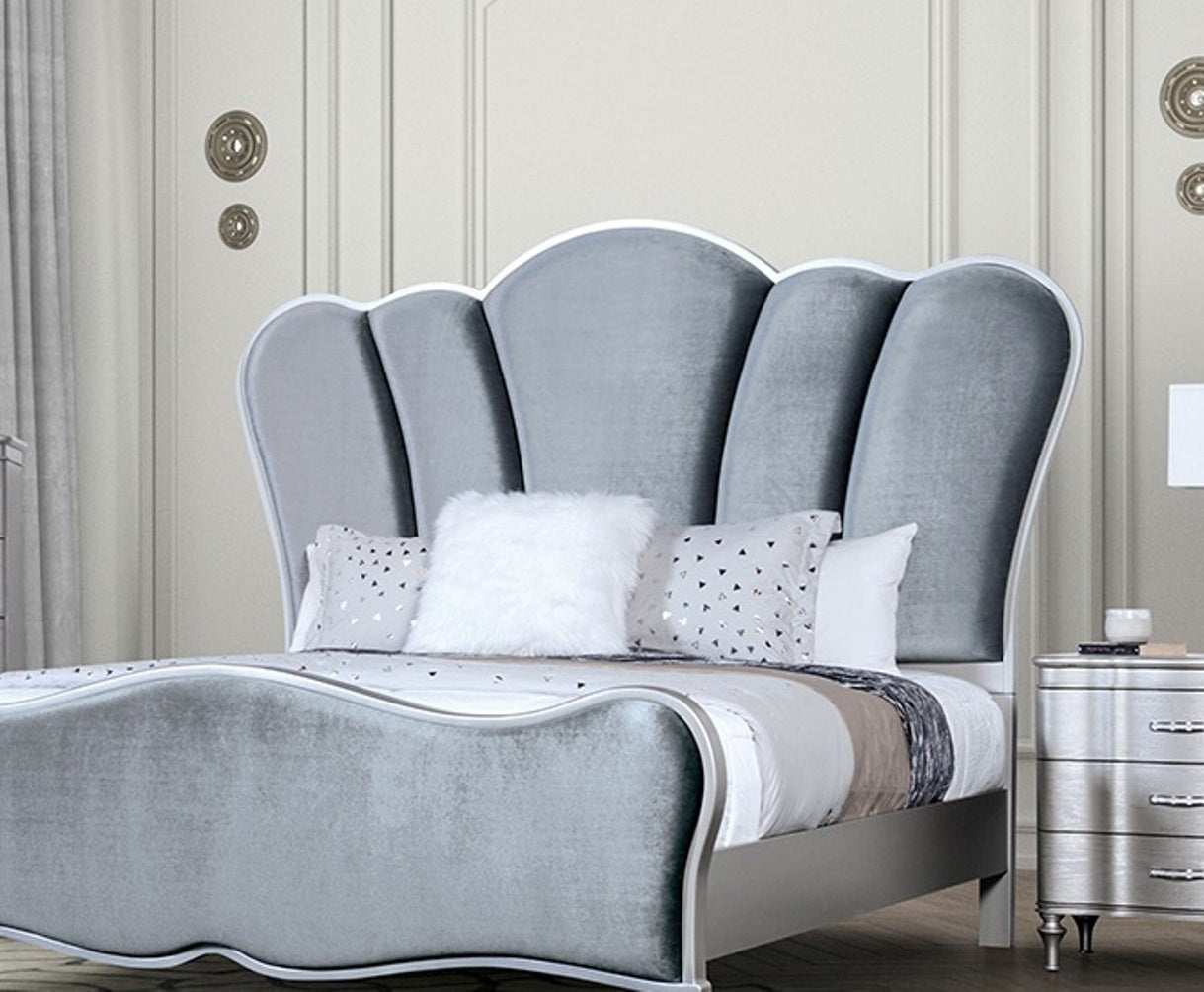 Glam Silver Fabric, Solid Wood, Others Padded Channel Headboard Turned Wood Leg. Upholstery Color - Light Gray