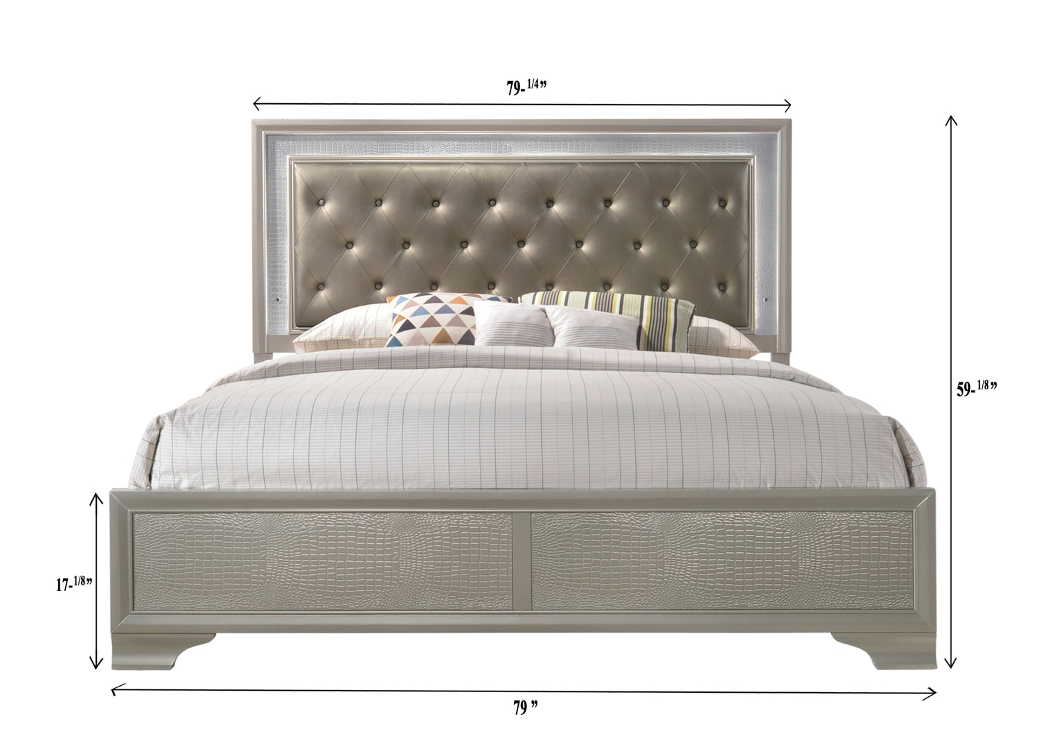 Modern Champagne Crocodile Skin Finish Upholstered 1pc King Size LED Panel Bed Faux Diamond Tufted Bedroom Furniture is available